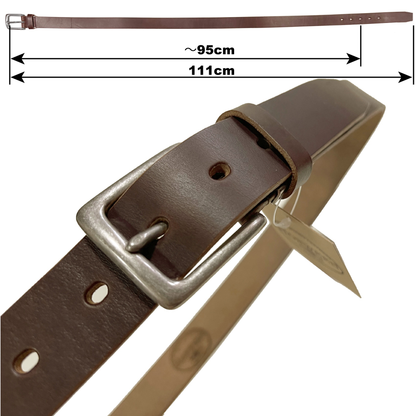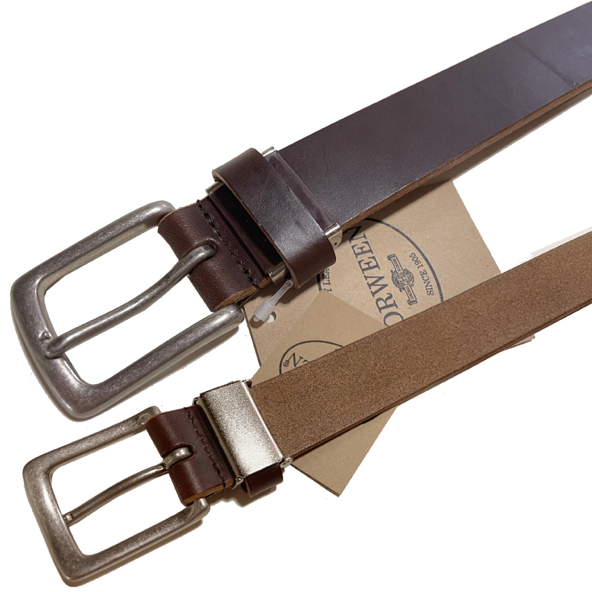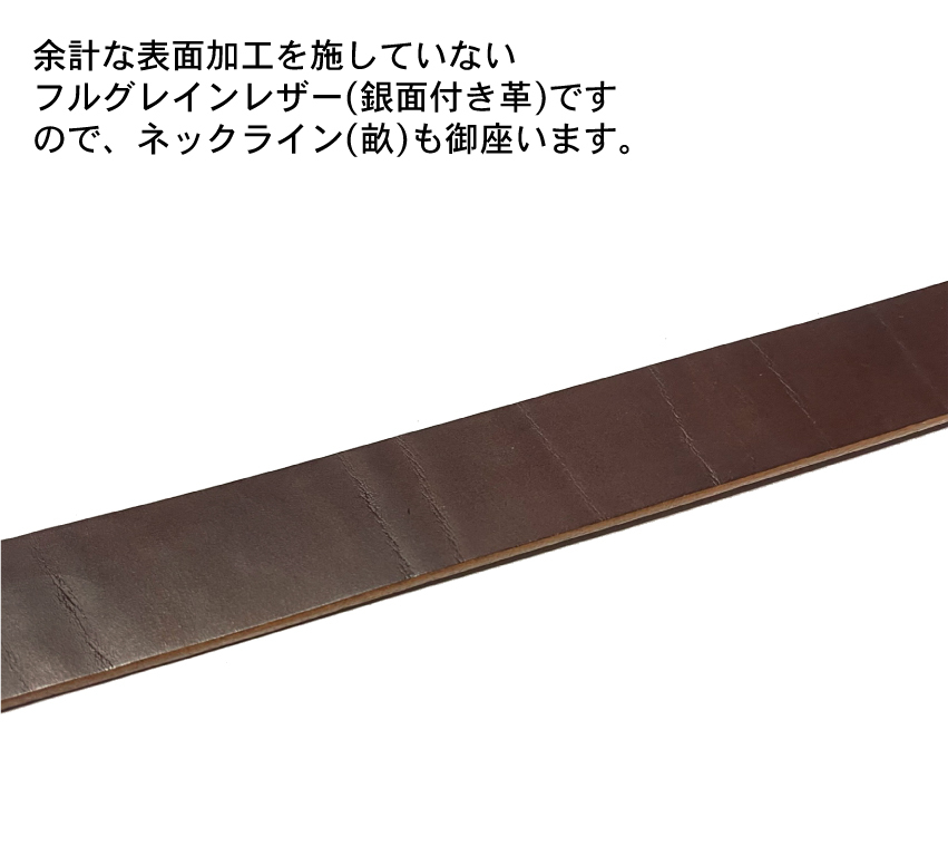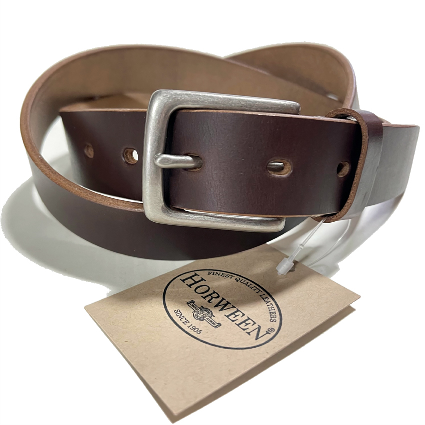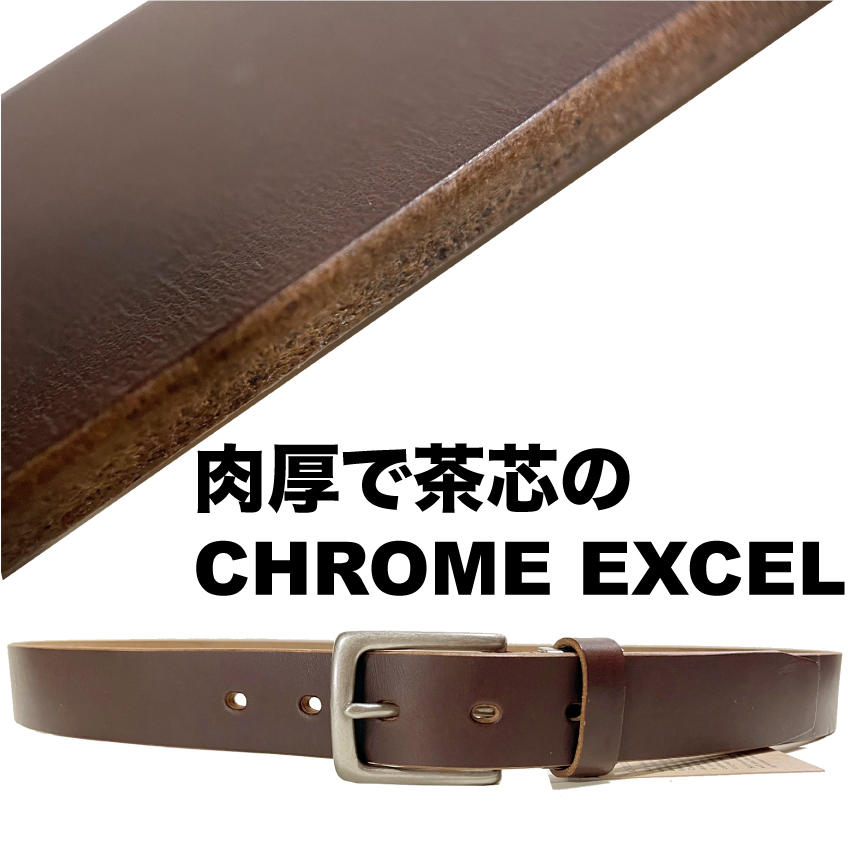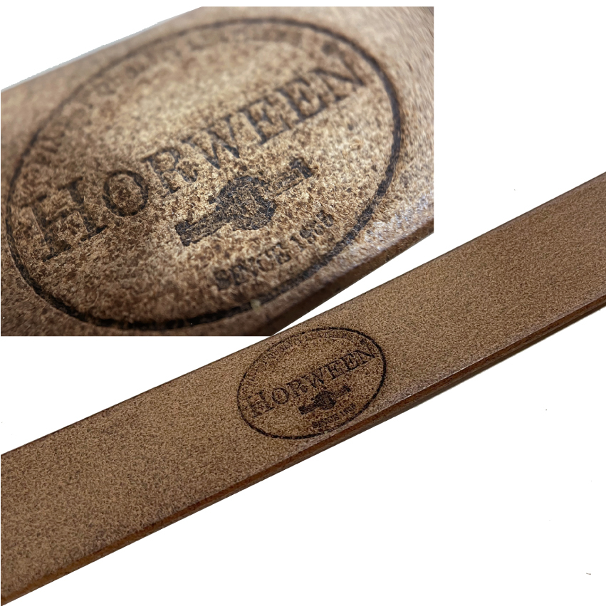 ホーウィン クロムエクセルレザーはAldenやWHITE'S等に採用される高級でタフなレザーです。熟練した日本の職人さんによる手作りです。アメリカ シカゴにある1905年創業のHorween社が製造する、元々はブーツのアッパー用の革ですので、2.2〜2.5mmの厚みの物が流通しておりましたが、こちらは3.8mmの分厚いタイプです。3.7mm厚は流通量も少なく希少な革です。この厚みのHorween Chromexceを使用したベルトで1万円を切る事はまず有り得ません。