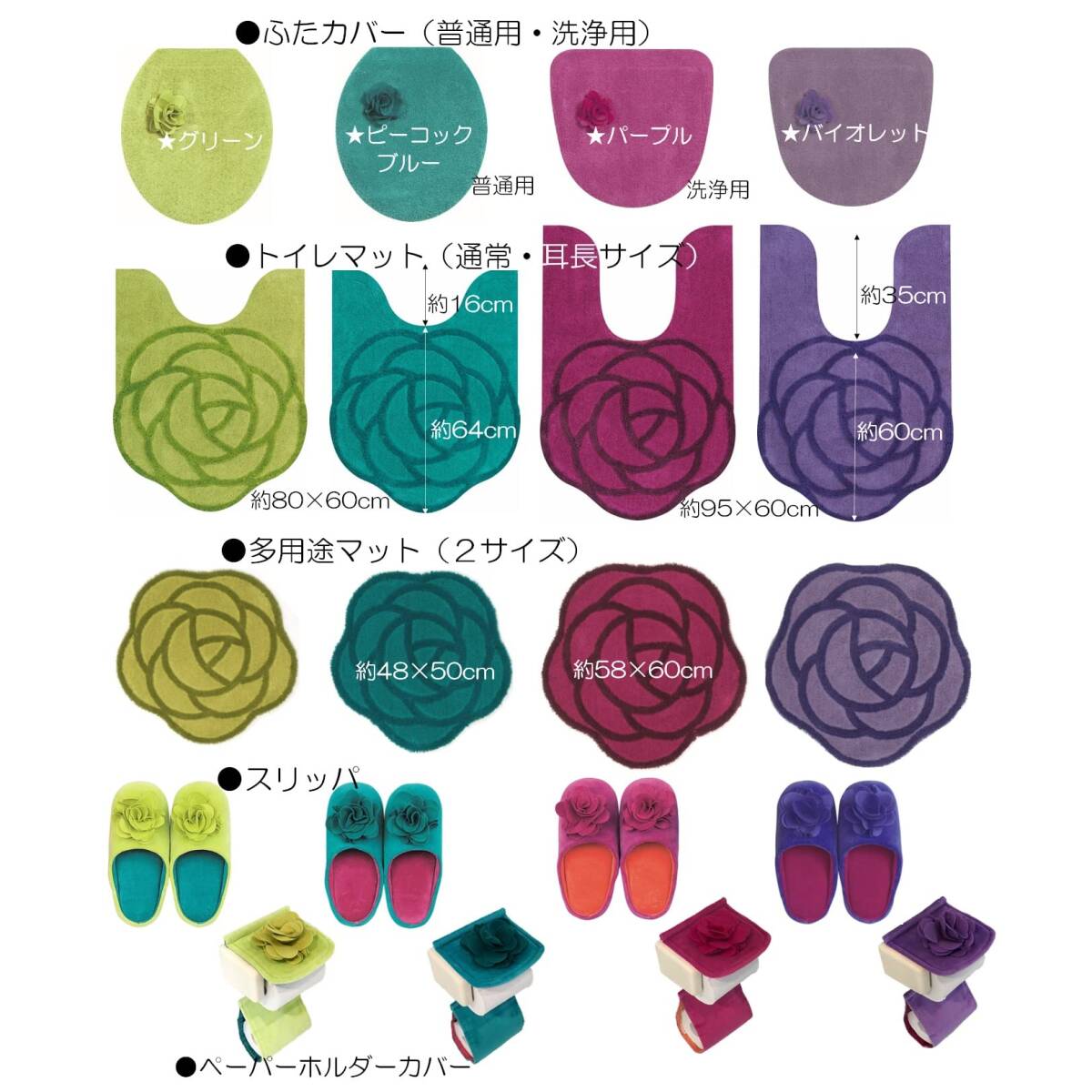 説明 大きなバラのフェルトモチーフの付いた温水洗浄・暖房用トイレふたカバー。ご使用になれない品番の便座がございますので、サイズ・適合表をお確かめのうえお買い求めください。トイレ空間をおしゃれに、個性的に飾っていただけます。ナチュラルなグリーン色、クールなピーコックブルー、モダンでエレガントなパープル色、個性たっぷりのバイオレット色と、選ぶ色でトイレが違った見え方に。4種類のサイズ・形状からマットを選んでいただけます。また、コーディネート可能なマットやスリッパ、ペーパーホルダーも取りそろえております。