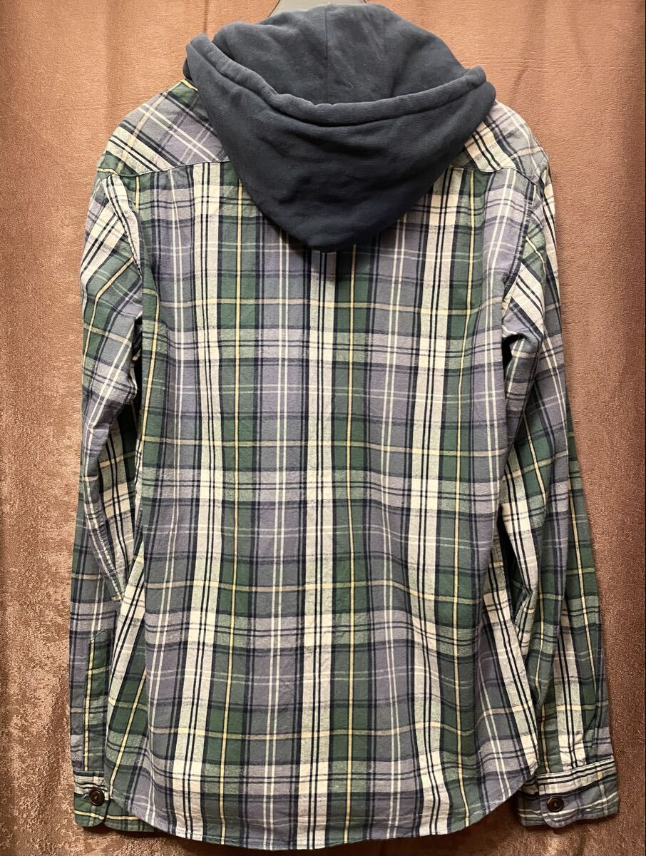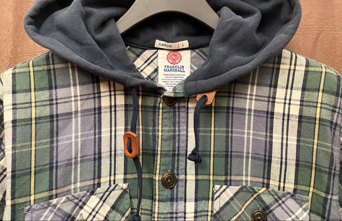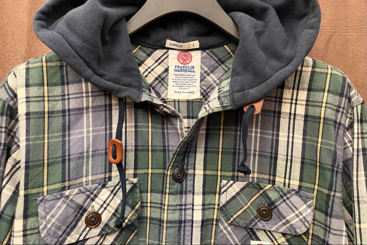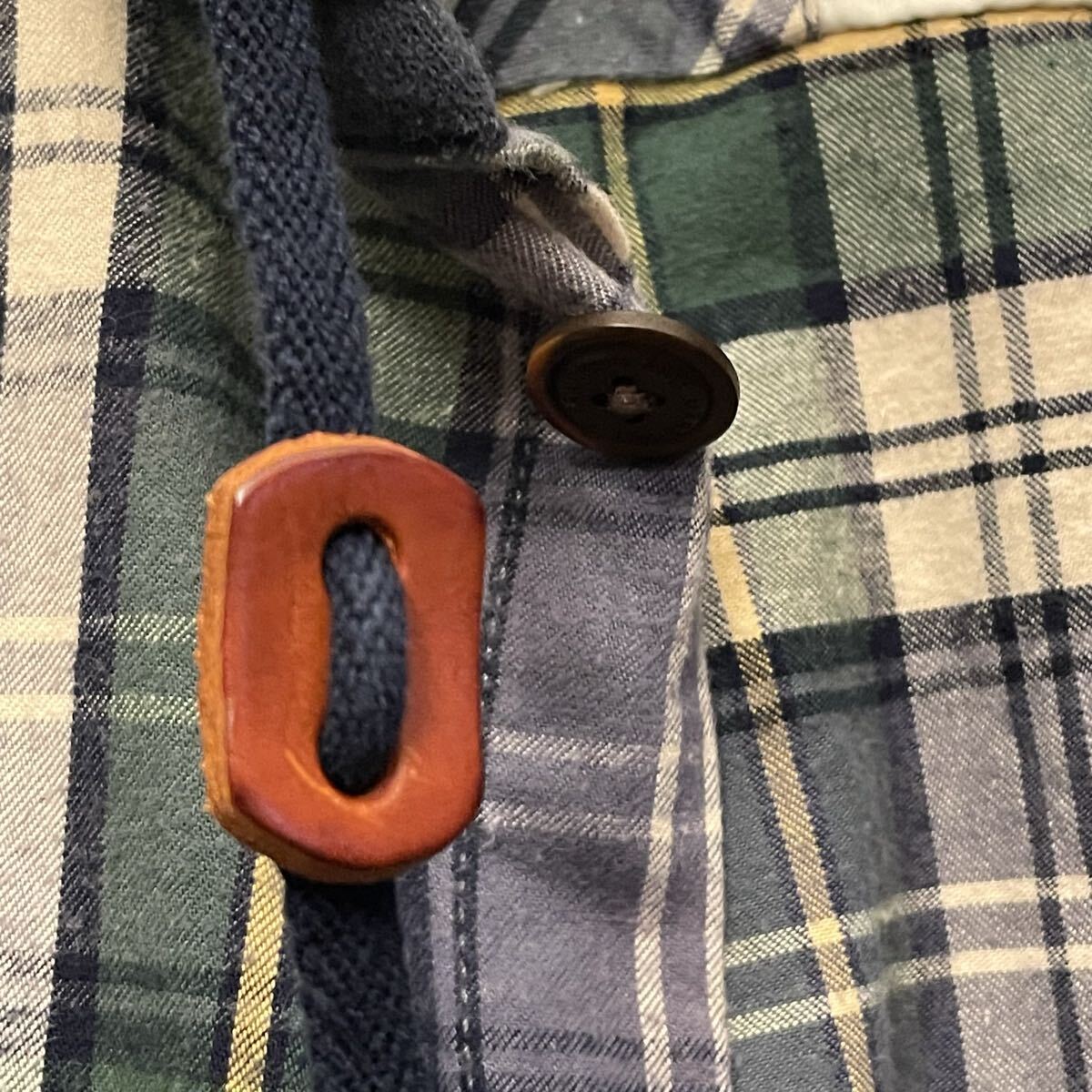 オシャレなグリーン系のチェック柄にネイビーのスウェット素材のフードを付けた珍しいデザインで、フード紐にレザーのアクセントを付けたり細部までこだわったおすすめの一品です。