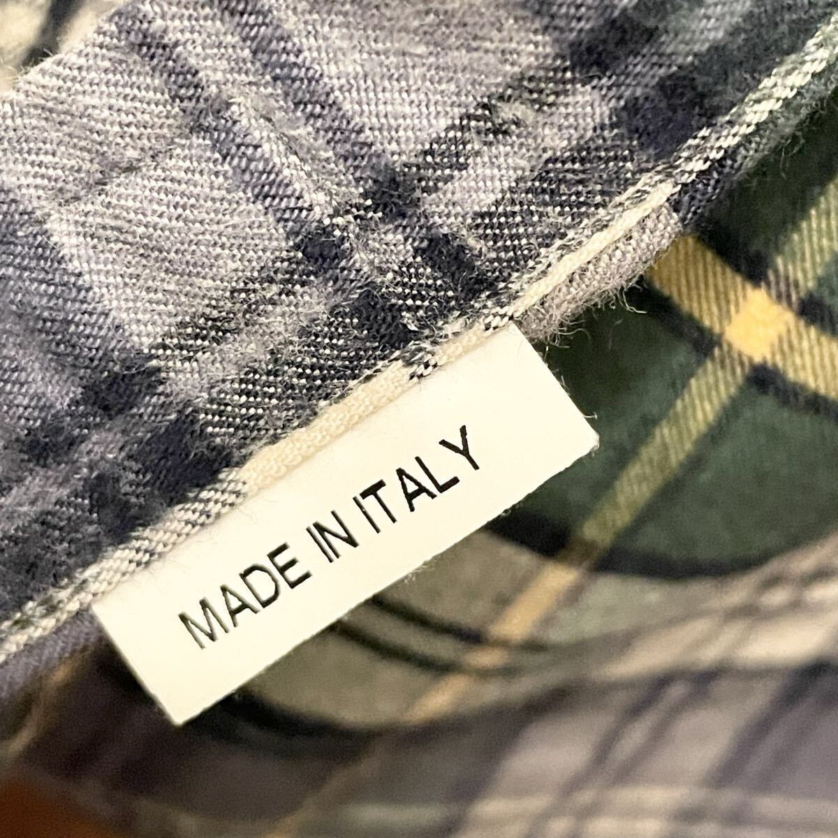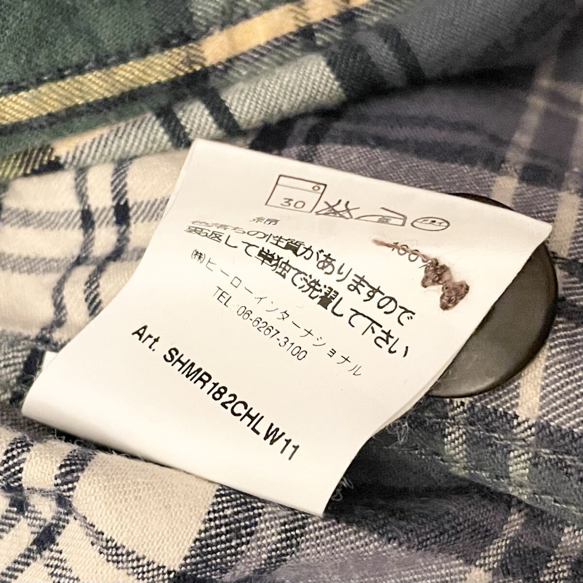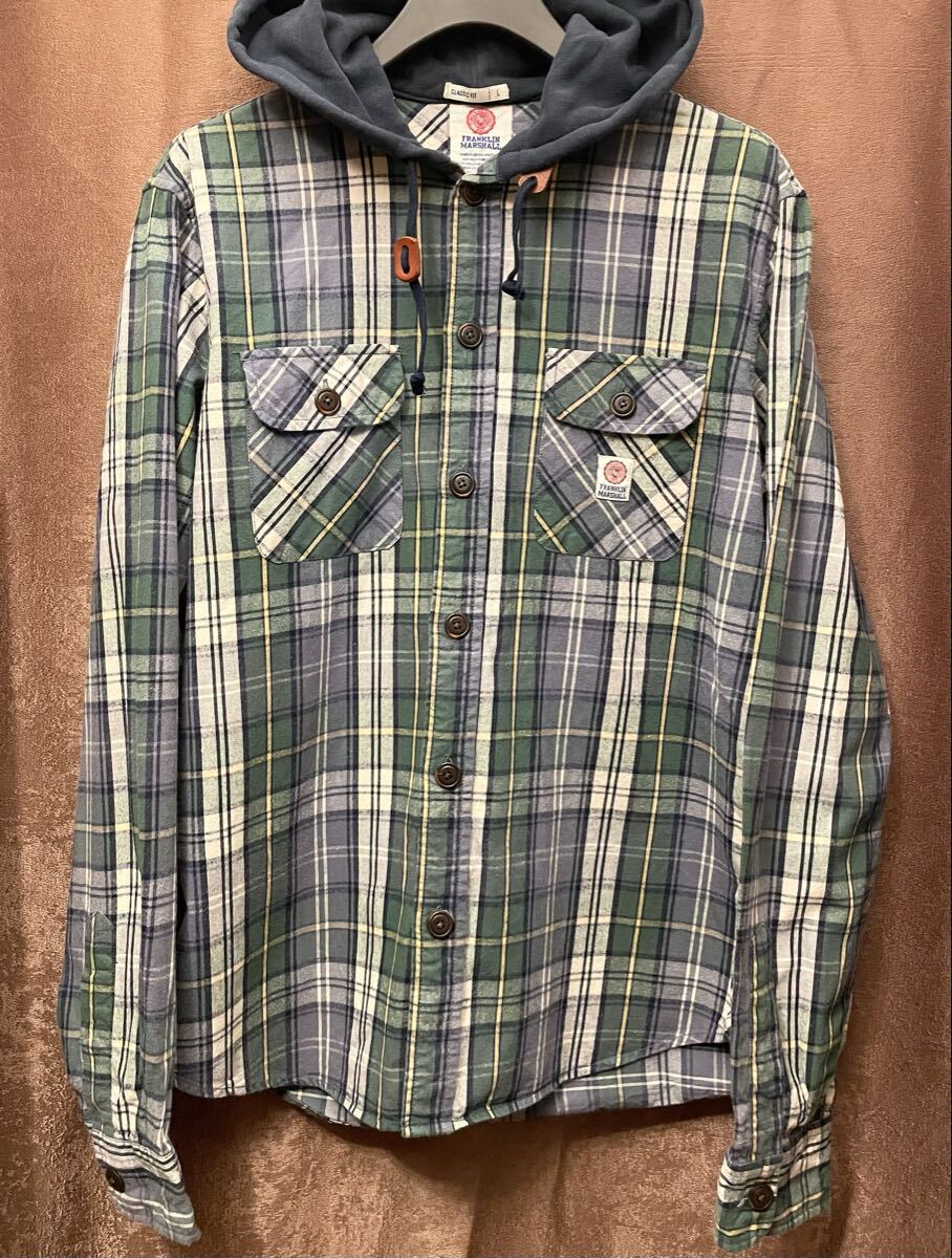 オシャレなグリーン系のチェック柄にネイビーのスウェット素材のフードを付けた珍しいデザインで、フード紐にレザーのアクセントを付けたり細部までこだわったおすすめの一品です。