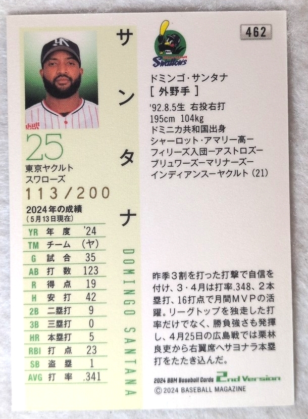 ★200枚限定★ サンタナ 東京ヤクルトスワローズ 113/200 BBM 2nd Ver 2024
