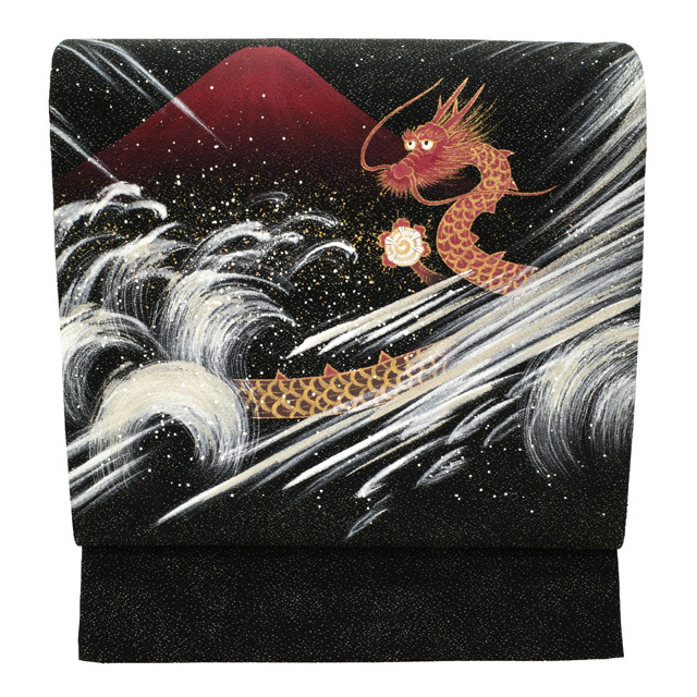 【新古品】 袋帯 未使用 正絹 手描き 黒地 ブラック 銀通し 富士山 赤富士 龍 雲龍 竜 ドラゴン 波 雲 金彩加工 作家物のようなデザイン レア柄 すずのき 扱い カジュアル 春 秋 冬 仕立て上がり みやがわ sb54444