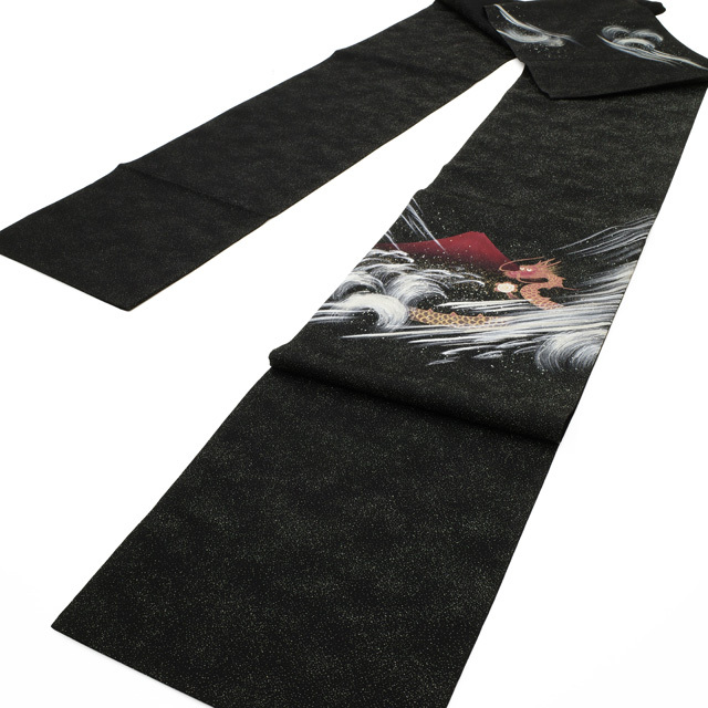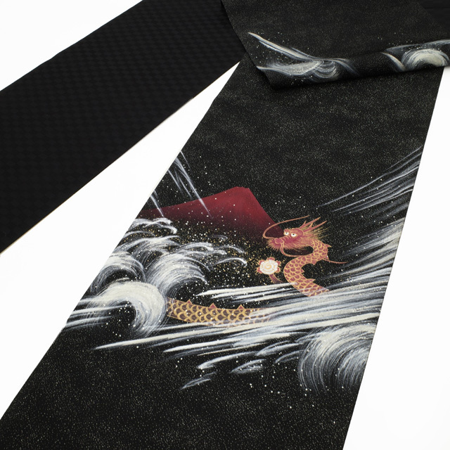 袋帯 未使用 正絹 手描き 黒地 銀通し 富士山 赤富士 龍 雲龍 波 雲 金彩加工 レア柄 カジュアル 新古品 仕立て上がり みやがわ sb54444