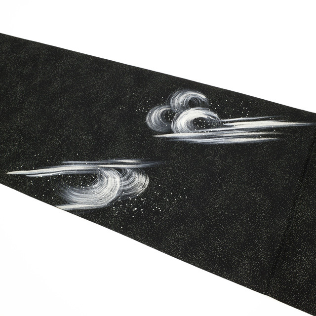 こちらの袋帯は、黒地に銀通しが施された上質な正絹を使用。