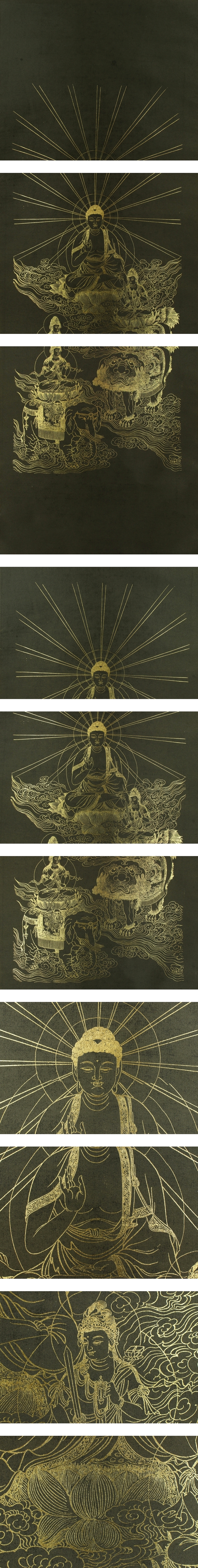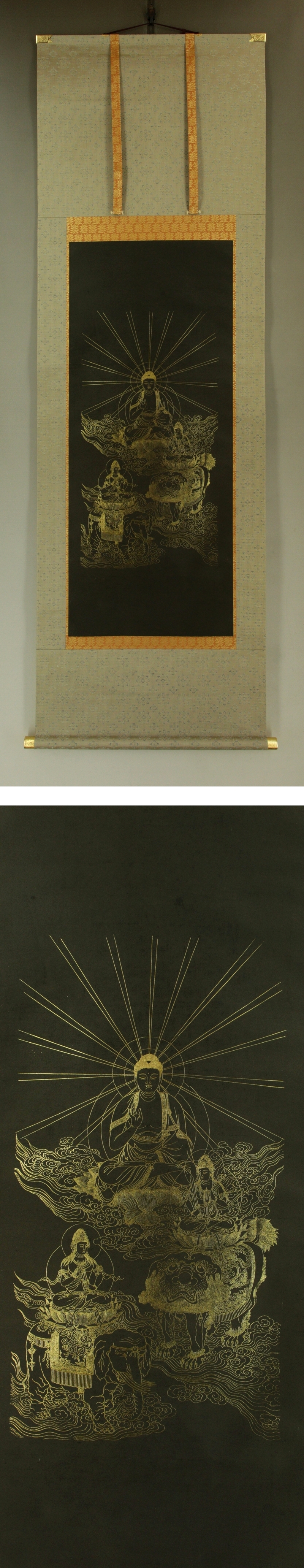 | №2506032【肉筆】仏画【紺紙金泥釈迦三尊】◆紙本◆合箱◆掛軸 | |