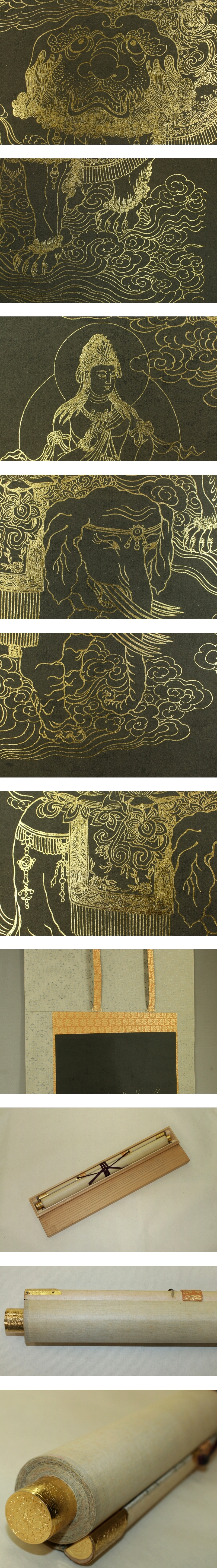 仏画【紺紙金泥釈迦三尊】 本紙は、軽い汚れ、軽い折れがあります。 表装は、軽い染み、軽い皺があります。 【サイズ】 作品 横約39cm×縦約94cm 表装 横約55cm×縦約171cm |