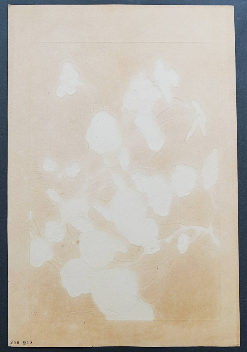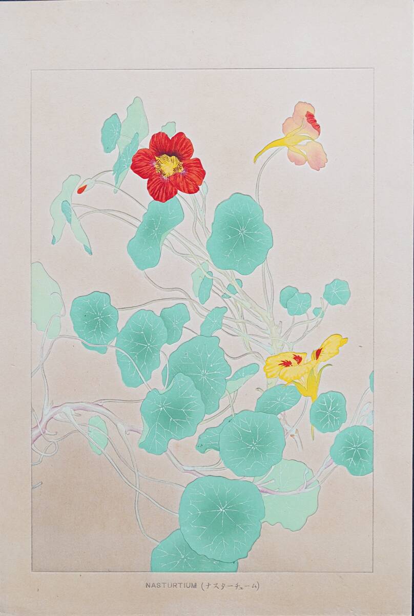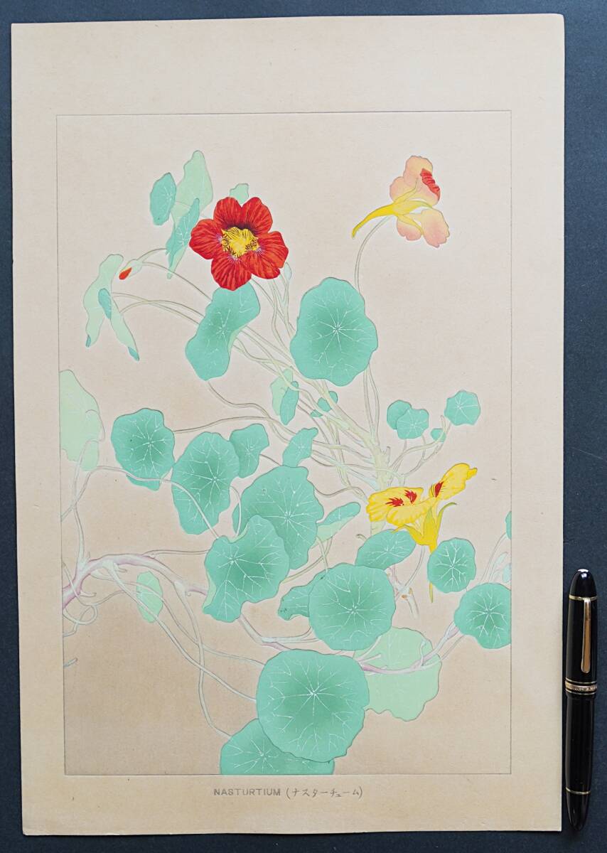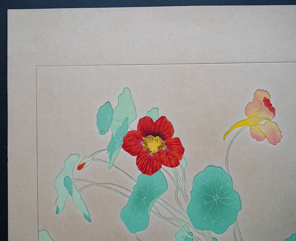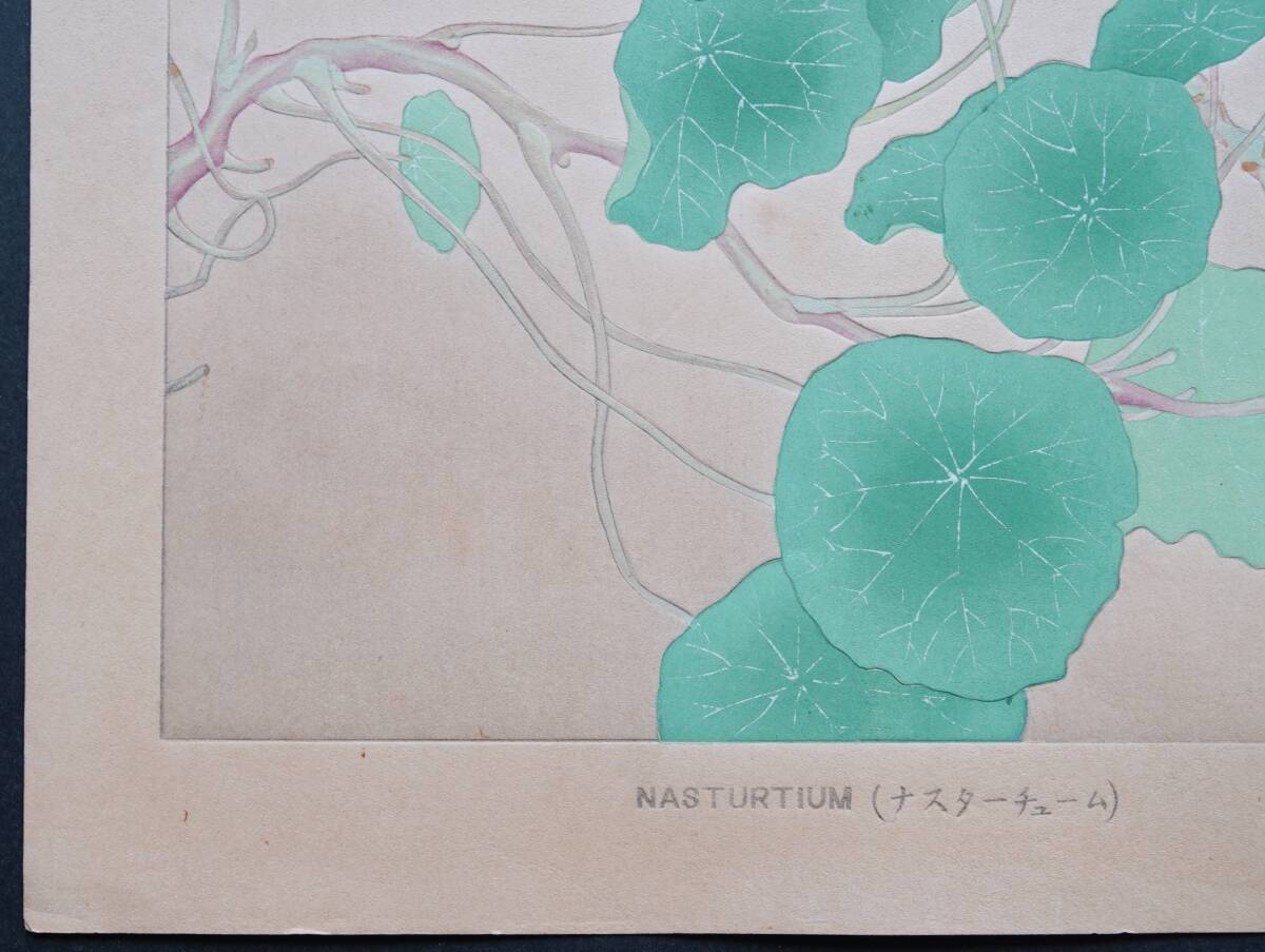 昭和3年制作 木版画1枚「Nasturtium(ナスターチューム)」(「洋草花譜」より) マリア画房刊 版画サイズ:(約)45x30.4cm ●作者:土屋楽山(つちや らくざん、1896-1976)京都市出身の画家、版画家。 本名:土屋浩三、号:篁子生。1913年-1920年の7年間、竹内栖鳳に師事。 植物画、花鳥画を得意とし、昭和初期から第二次世界大戦前頃まで自身の工房で自刻・自摺の木版画を制作。 主に海外市場を中心に作品を制作し、日本では知られざる作家でしたが、近年芸艸堂により復刻版画が制作され、再評価されています。※本作品が万一、公定鑑定人、または公定鑑定機関により、 真作でないという判断がされた場合は、返品・全額返金を受け付けます。 ※商品ご落札日より1週間以内に鑑定される旨をご連絡下さい。 ※鑑定料、鑑定に伴う諸経費は落札者様のご負担となりますので予めご了承下さい。 ■コンディション 経年によるヤケ・小シミ、角余白に軽いシワ、裏面に数字印が有ります。 ■発送方法 送料:全国一律1080円