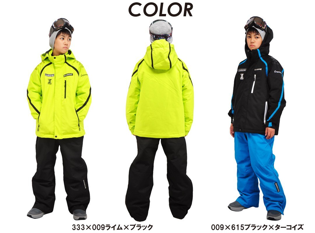 | 詳細 | ジュニア スキースーツ CHROME クロム サイドフルジップ 上下セット スキーウェア 子供用 耐水圧10000mmを採用し、浸水しにくい仕様です。 【カラー】 009×615ブラック×ターコイズ 056×009レッド×ブラック 333×009ライム×ブラック 615×009ターコイズ×ブラック 【素材】 ・表地:ポリエステル100%(ポリウレタンラミネート加工) ・裏地:ポリエステル100% ・中わた:ポリエステル100% 【耐水性】 耐水圧:10000mm 透湿性:5000g/m2/24hrs 【機能】 【ジャケット】 ・フード取外し可能 ・襟裏トリコット ・左袖パスケース(収納可能) ・裾ドローコードで調整可能 ・袖口はマジックテープにて調節可能 ・フロントファスナーの引手はホイッスル機能付き ・フロントポケット2か所 ・左胸ポケット1か所 ・サイズ調節機能付(最大15センチ)*ジャケットのみ ・ネームプレートあり 【パンツ】 ・サスペンダー(取り外し可能) ・ウエストアジャスター ・前ポケット2箇所 ・サイドフルオープンファスナー ・ネームプレートあり ・雪の浸入を防ぐ足口スパッツ 【平置き実寸サイズ】※目安としてご参考ください。 130cm:身幅/44cm、身丈/55cm、袖丈/41cm、胴囲/33cm、ヒップ/47cm、股下/54cm 140cm:身幅/45cm、身丈/59cm、袖丈/45cm、胴囲/34cm、ヒップ/50cm、股下/58cm 150cm:身幅/47cm、身丈/63cm、袖丈/48cm、胴囲/36cm、ヒップ/52cm、股下/62cm 160cm:身幅/51cm、身丈/66cm、袖丈/50cm、胴囲/38cm、ヒップ/54cm、股下/67cm 170cm:身幅/53cm、身丈/69cm、袖丈/52cm、胴囲/40cm、ヒップ/56cm、股下/70cm |