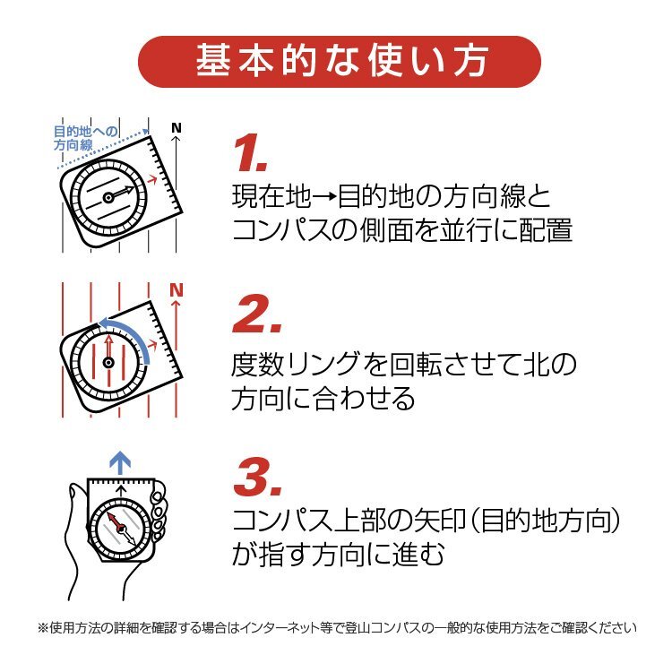 ※使用方法の詳細を確認する場合は、インターネット等で登山コンパスの一般的な使用方法をご確認ください