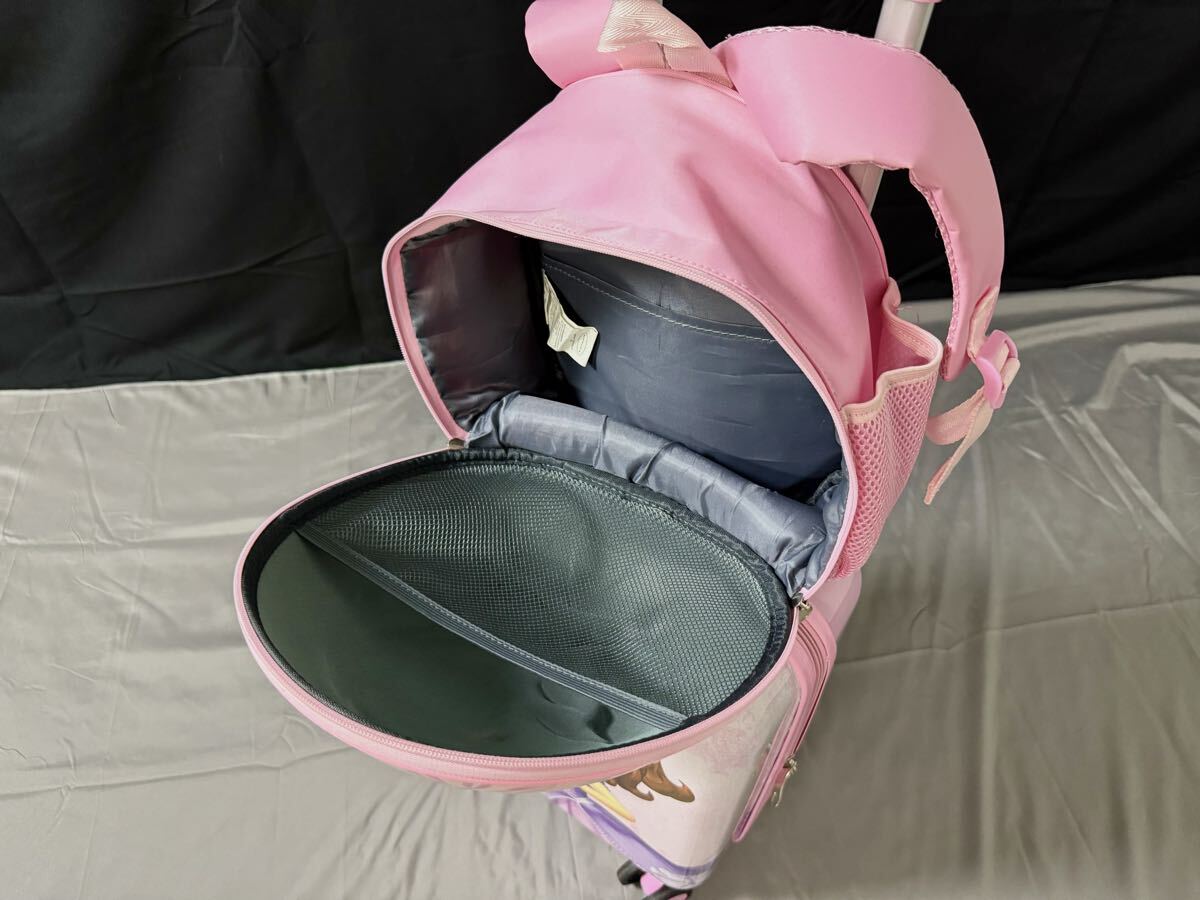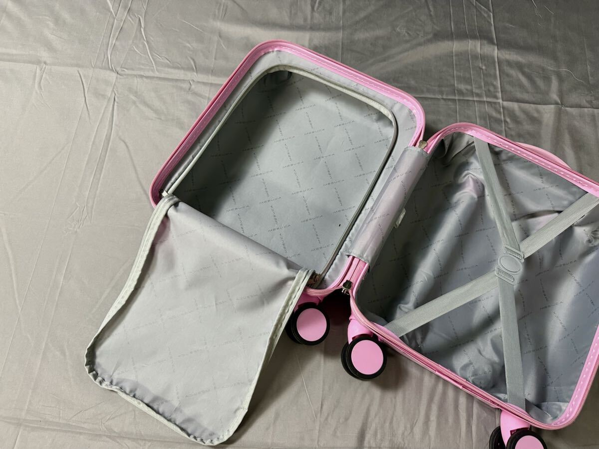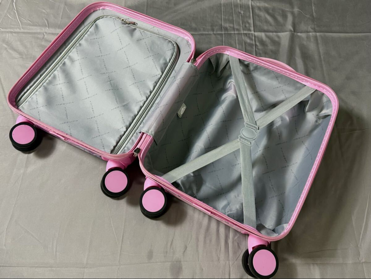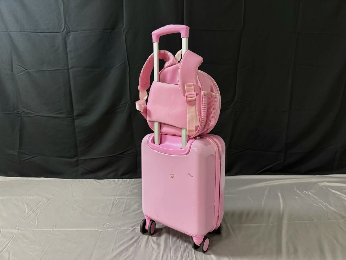キャリーケースは16インチサイズで、機内持ち込みも可能な大きさ。軽量で丈夫な素材を使用し、360度回転する4輪キャスター付きでお子様でも楽々移動できます。