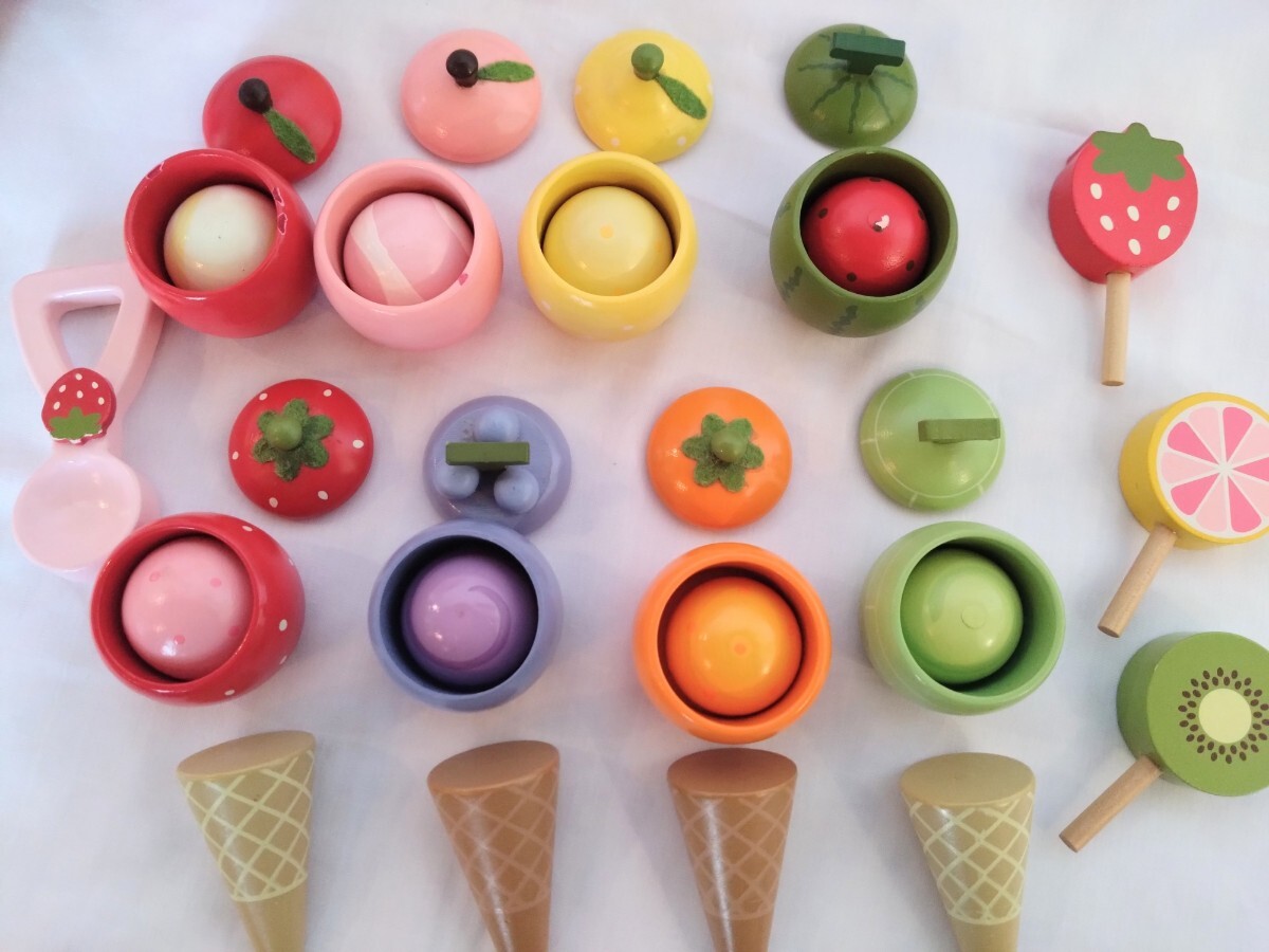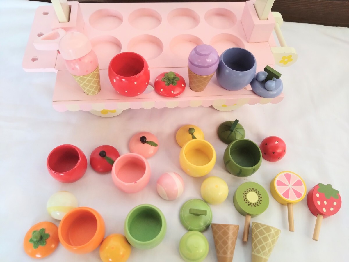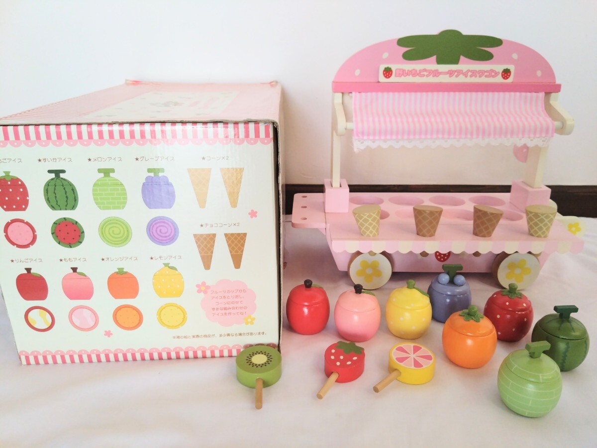 ピンクのワゴンにたくさんのフルーツアイスやコーンが付属していて、アイス屋さんごっこが楽しめます。