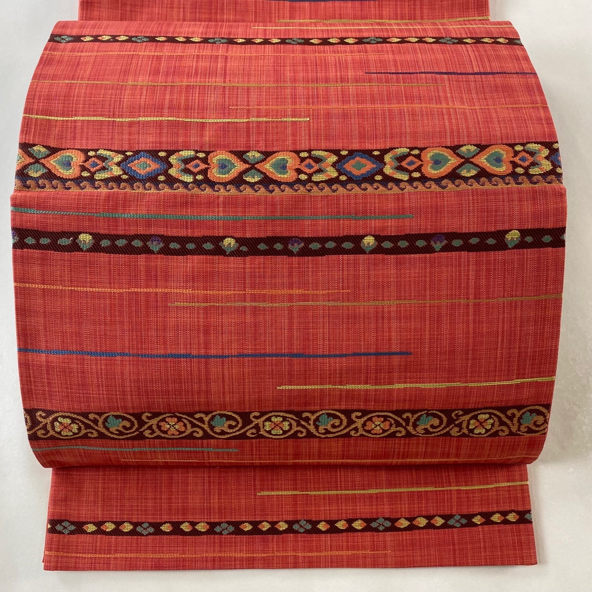 | 袋帯 美品 秀品 紬地 花唐草 縞 金糸 ピンク 六通 正絹 【中古】 |