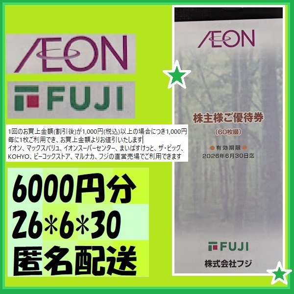 6000円分 フジ 株主優待券イオン マックスバリュ イオンスーパーセンター まいばすけっと ザ・ビッグ KOHYO ピーコックストア フジの直営