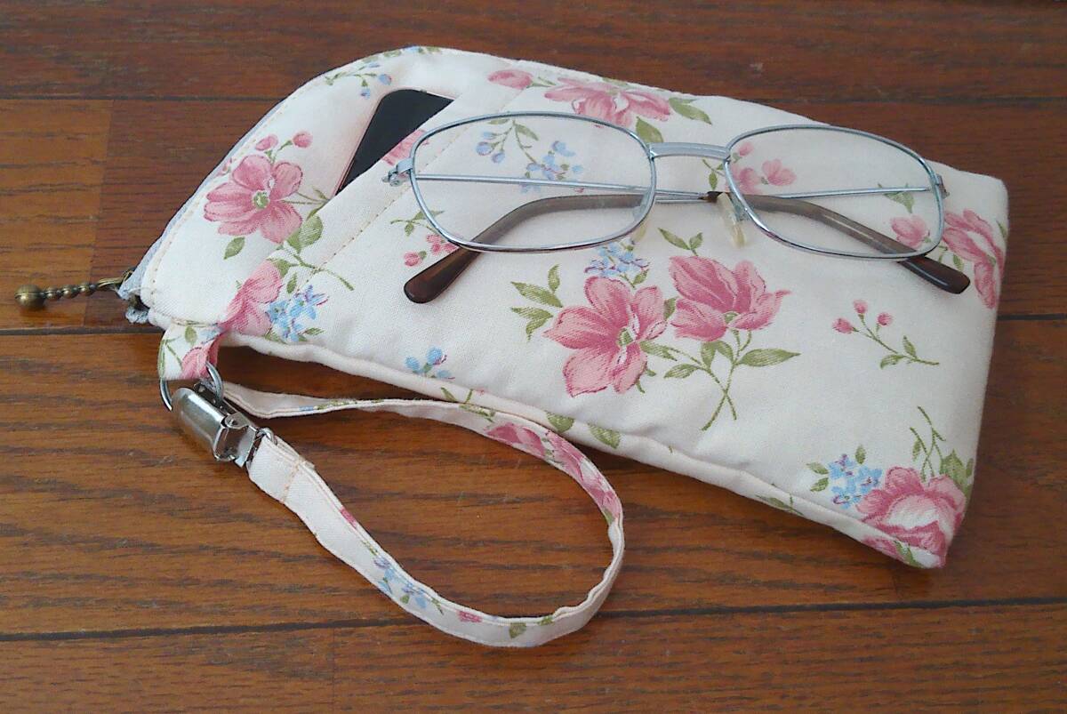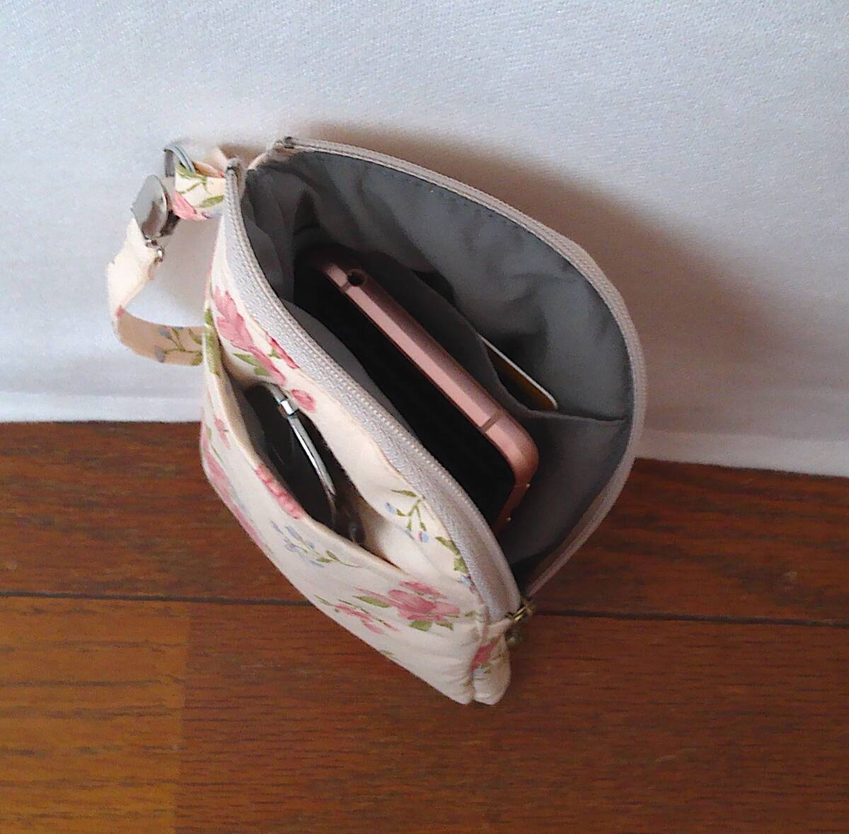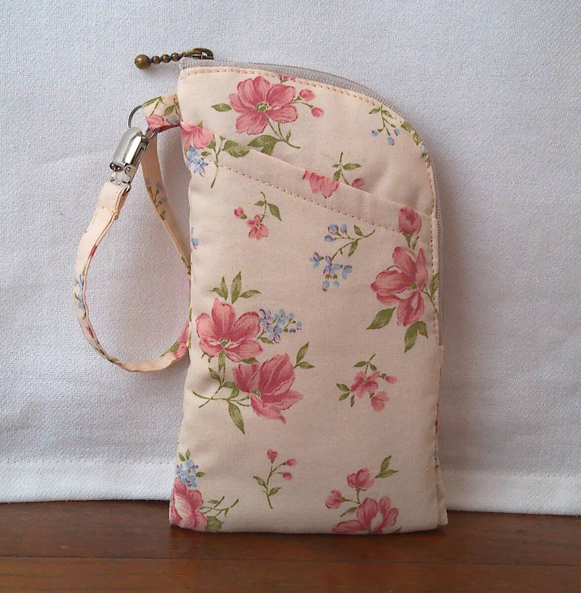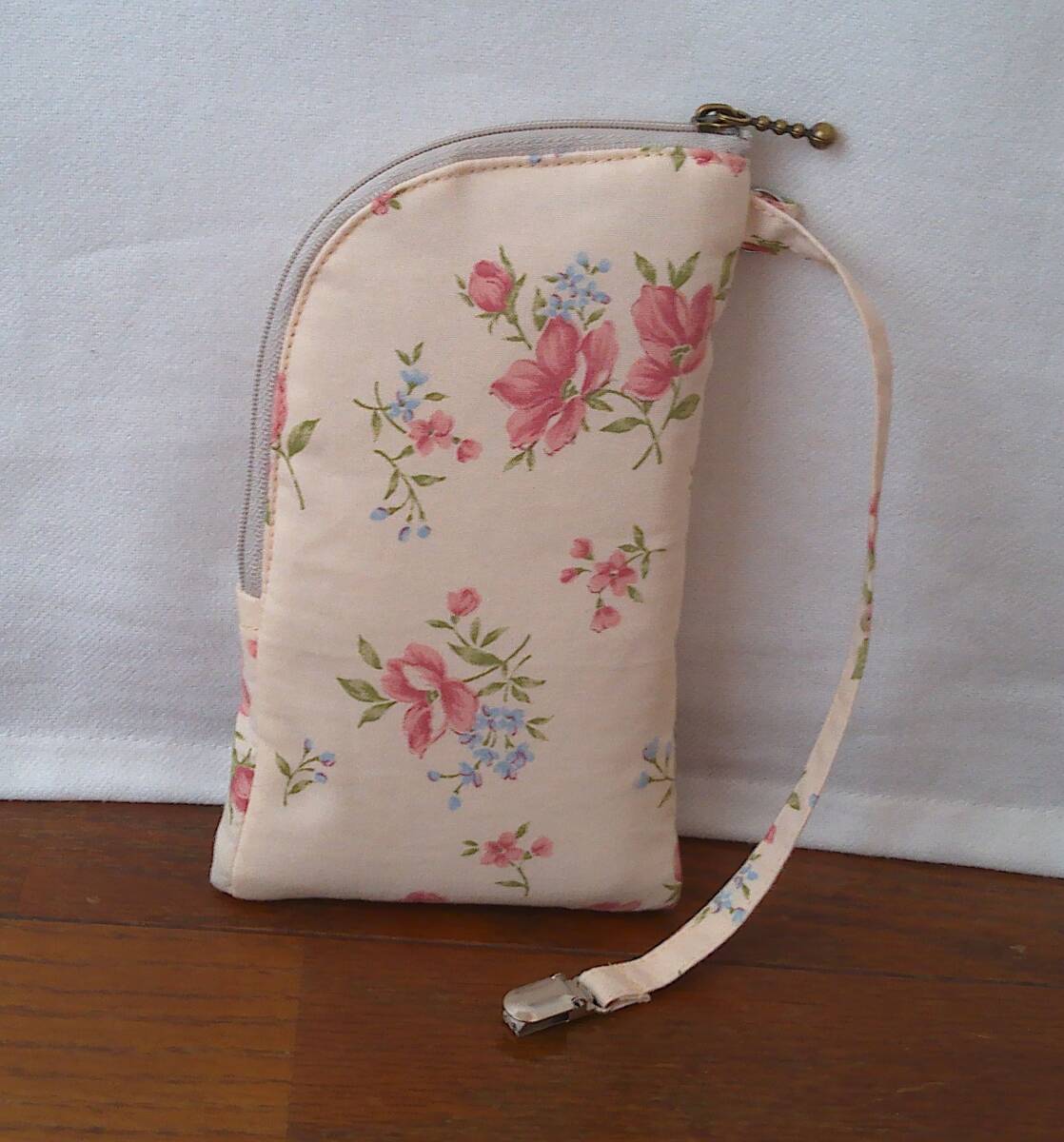 | スマホケース・ファスナー★オレンジベージュ地ピンク系花葉っぱ |