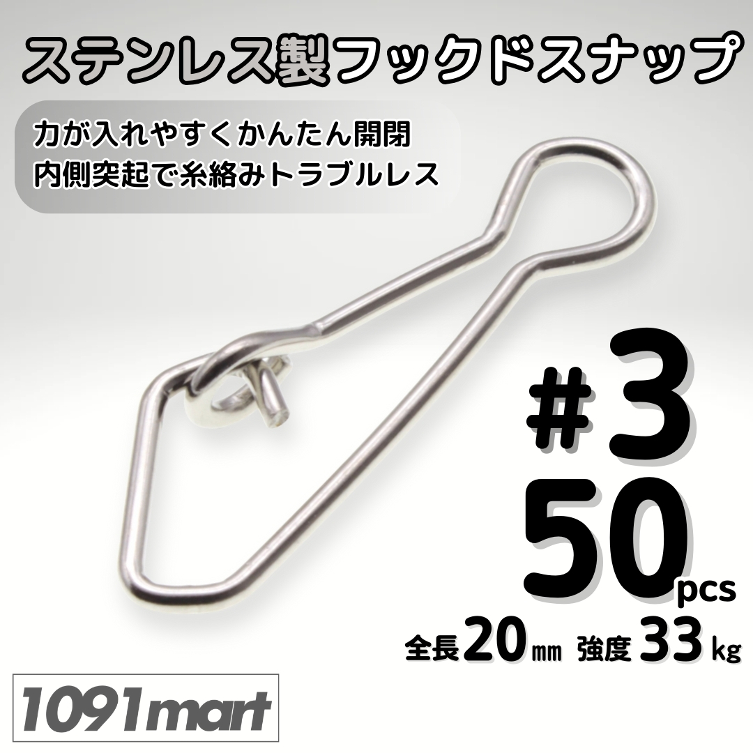 ステンレス製 フックドスナップ #3 50個セット インタースナップ ルアー釣り エギング かんたん開閉 すり抜け抜群!【1091mart】