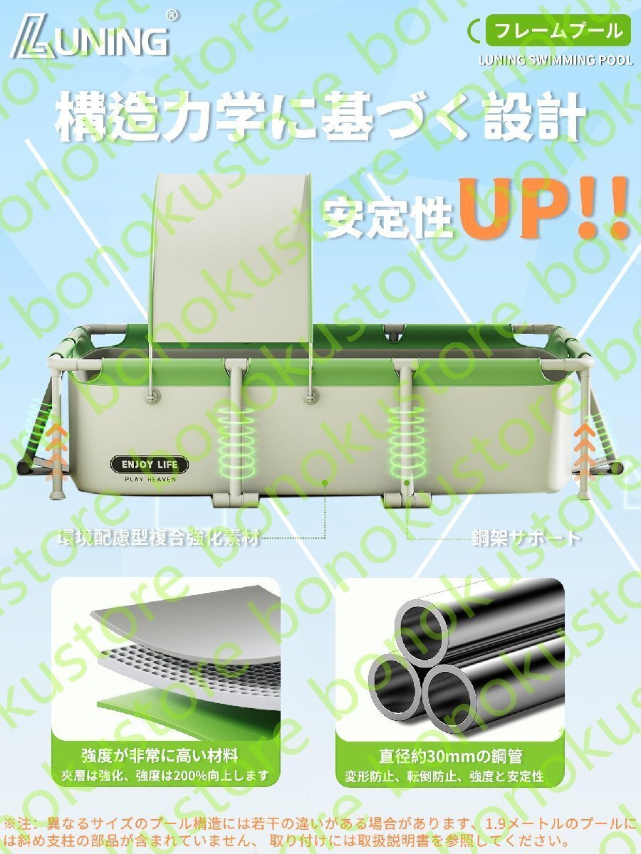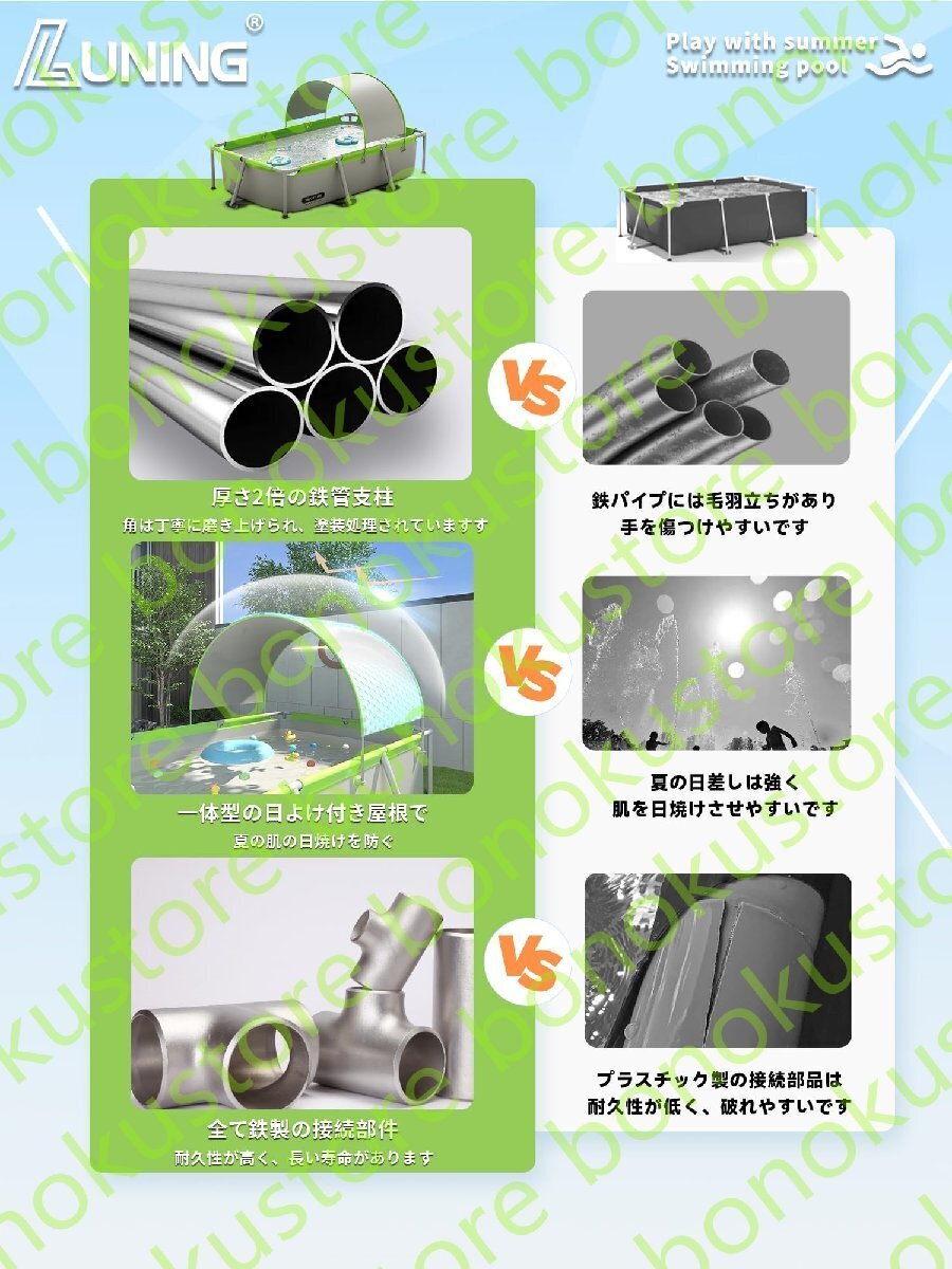 ??【構造力学設計&斜め補強支柱】構造力学の原理に基づいては異なるサイズのプールに最適な安定性を確保するために、異なる荷重設計を採用しています。1.9メートルのプールでは、6本の垂直柱を使用していますが、2.9m、4.2m、および4.9mのプールでは、垂直柱と斜め補強柱を組み合わせた設計を採用しています(斜め補強柱の数は製品のサイズによって異なります)。改良されたプールは、構造力学により適合性が高く、優れた安定性と耐圧性を提供します。また、製品には日よけのキャノピーが付属しているため、最も暑い夏の日でも強烈な日差しを心配する必要はありません。