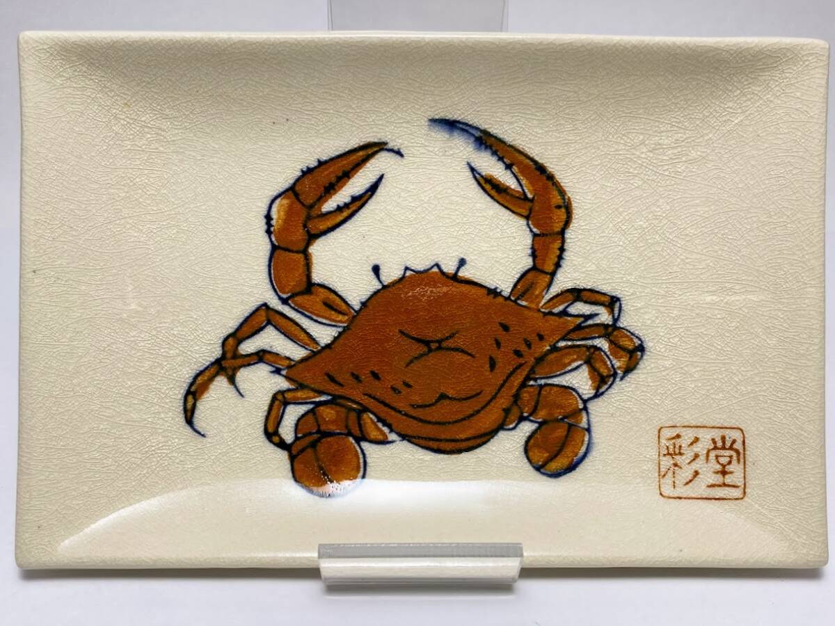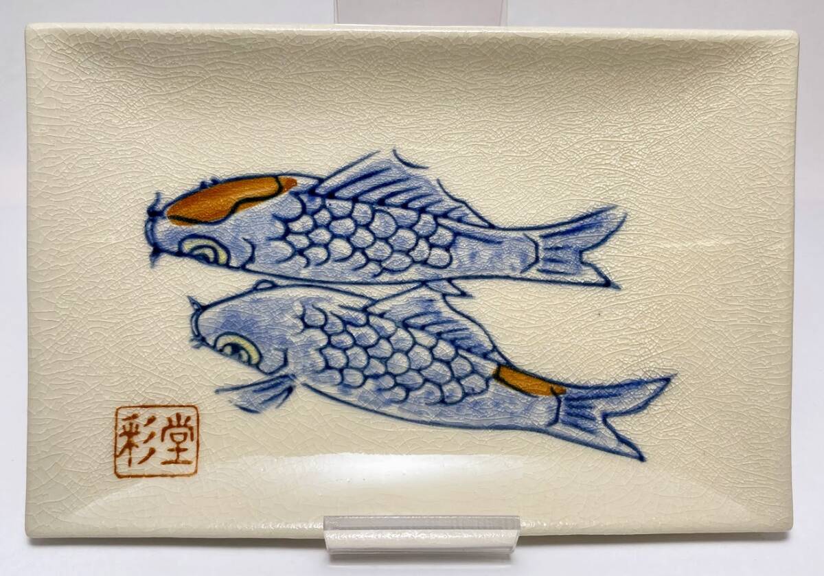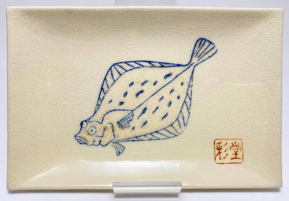 【在銘有り】赤津焼 彩堂 造 魚文 長角皿 貫入 お魚さん 淡水魚 カニさん 海 魚釣り 渓流釣り お笑い漫画道場