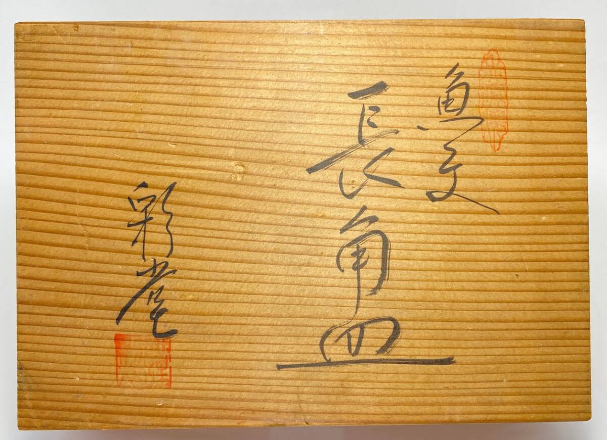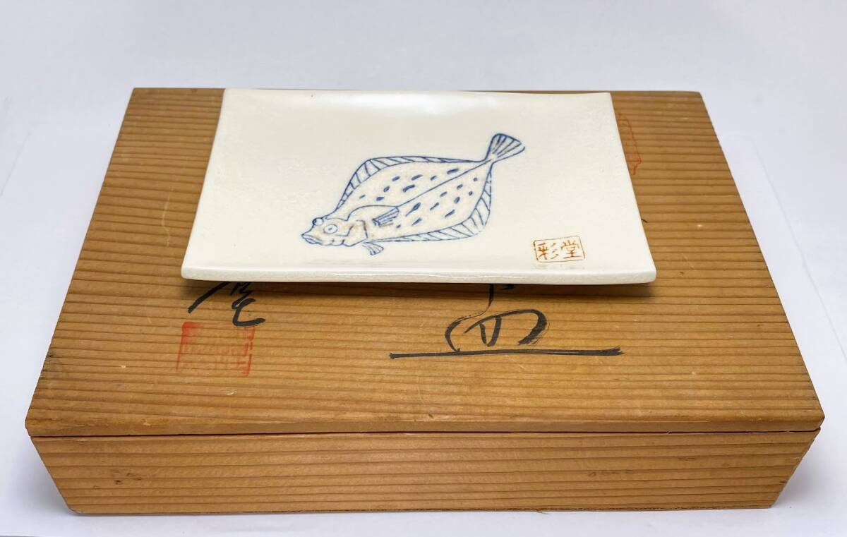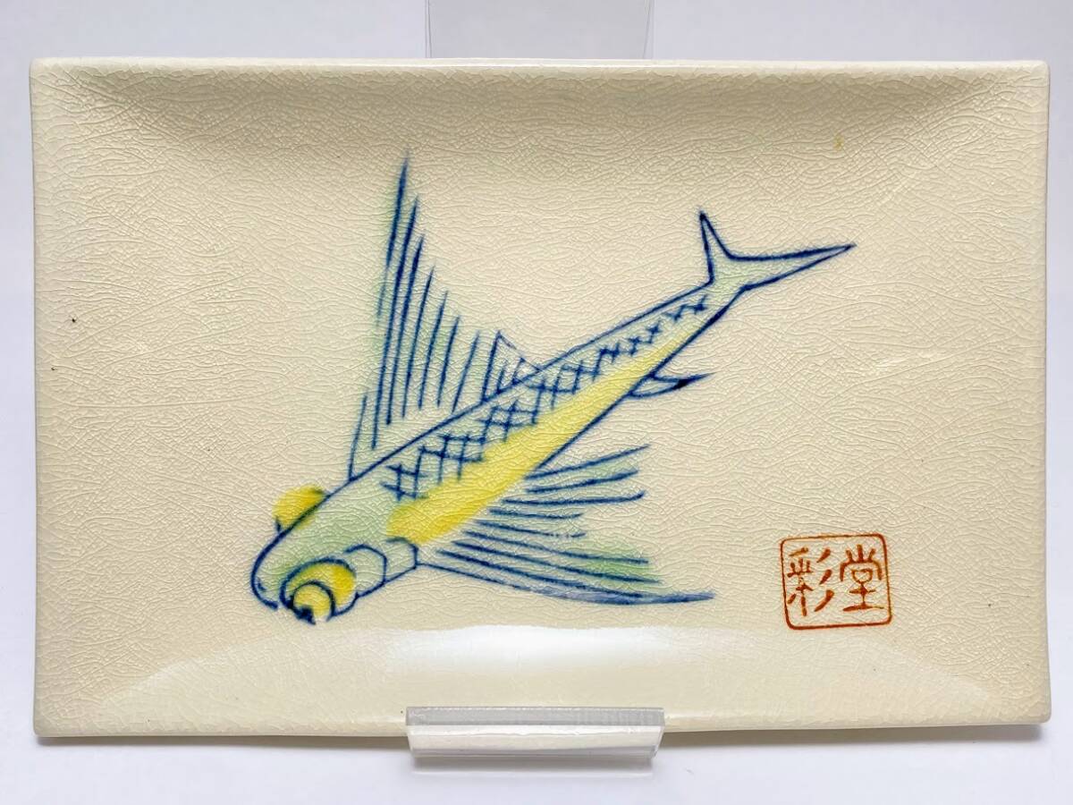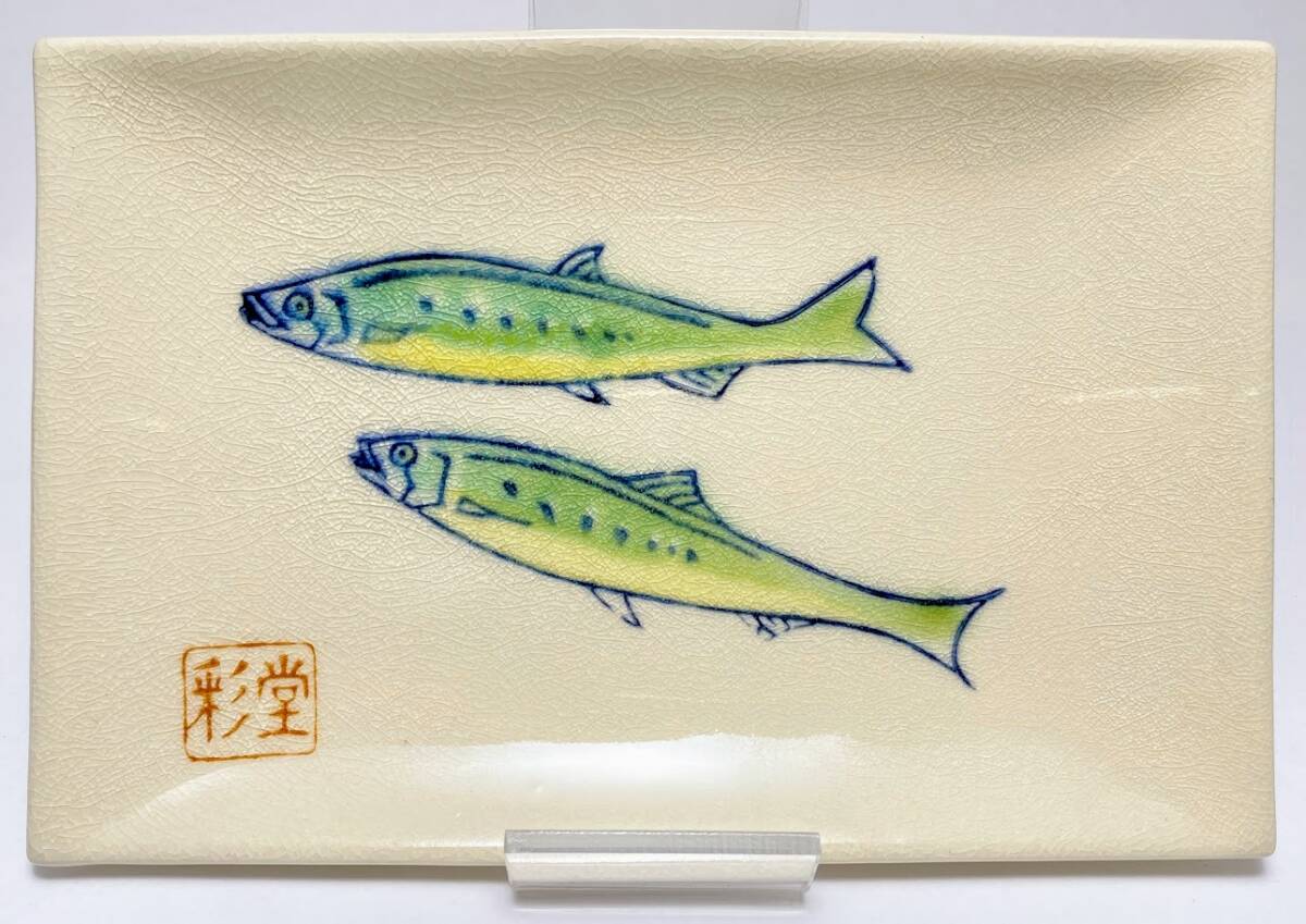 【在銘有り】赤津焼 彩堂 造 魚文 長角皿 貫入 お魚さん 淡水魚 カニさん 海 魚釣り 渓流釣り お笑い漫画道場