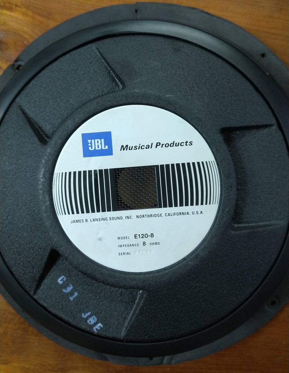 JBL E120(8Ω 30cmフルレンジ)単品の出品です。エレキギター用やオーディオ用として音の良い事で有名です。マグネットの大きいユニットは音が良い事を証明したようなユニットです。 俊敏でエネルギー特性が200〜2Khzまでフラットなこのユニットは情報量が多くミッドバス用に良いとして大変有名です 裏ワザとして重たい音のウーファーエンクロージャーにローカットせず並列に使用して瞬発力の改善に使う事も有効です。 コーンにシワはありませんが、センターキャップに少し錆びがあります。 DCRは5.9Ωの動作確認良好の良品です。 よろしくお願いいたします 特性は写真9枚目を参照下さい。