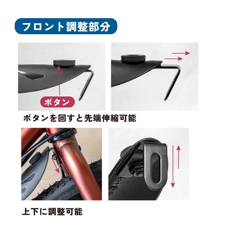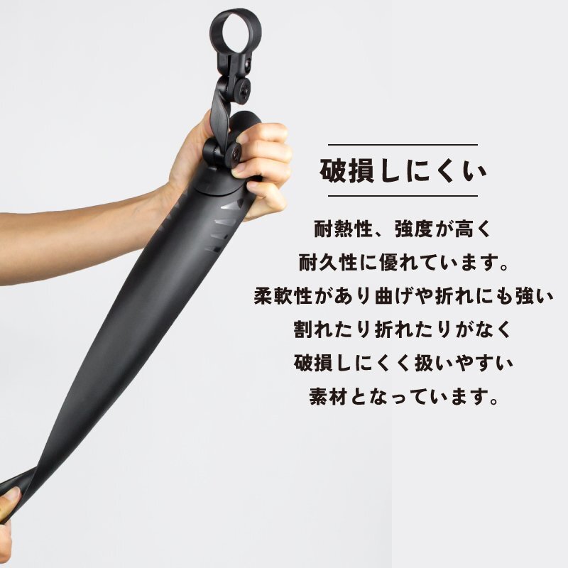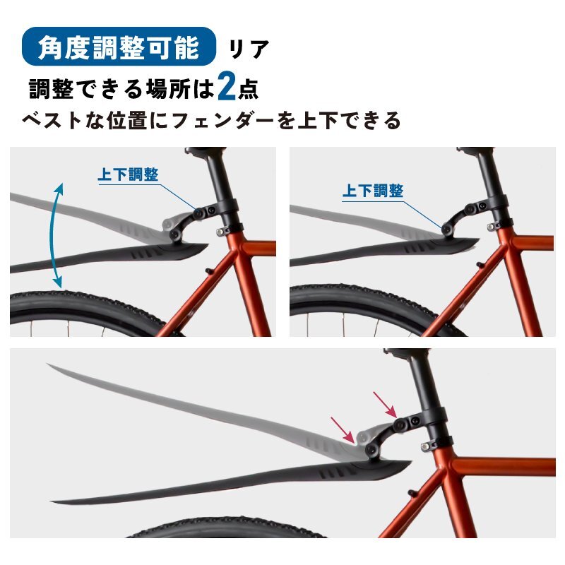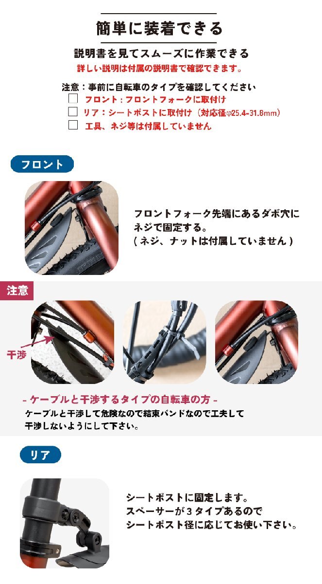 濡れた路面を走る時に前輪や後輪から跳ね上げられる泥や雨水をお尻や背中にかかるのを防ぐアイテム泥よけです。 |