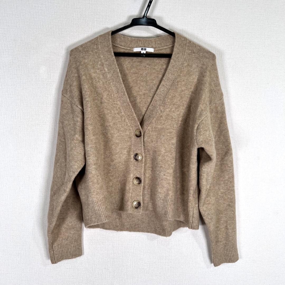 女性用 レディースのベージュ系の長袖ニットカーディガン トップスです。中古品ですが目立つ傷や汚れもなく、まだまだ使えます。古着 ユニクロ UNIQLO