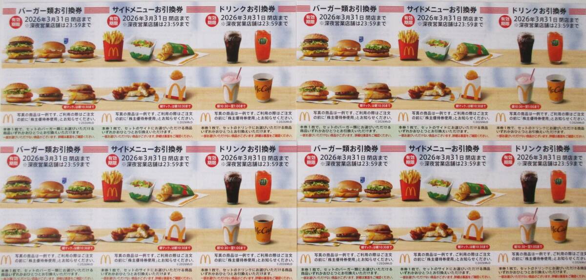 ★商品説明★ マクドナルドの株主優待引換券4セット(①②③×各4枚)です。 ①バーガー類引換券×4枚 ※夜マックパティ倍、サムライマック ②サイドメニュー引換券×4枚 ※ポテトLサイズ ③ドリンク引換券×4枚 ※ドリンクLサイズ、キャラメルラテMサイズ、各種マックフロート ※は引換可能なお得感(価格)の高い商品例です。 ★有効期限★ 2026年3月31日迄 ★発送方法★ ・定形郵便(追跡なし、補償なし)¥110 ※定形郵便は配達日数が遅め(土日祝を除いて最短3~5日程度)です。 ・ネコポス(追跡あり、補償あり)¥230 ※土日祝の配達あり、急ぎの方はこちらをおススメします。 ★注記★ ・取引簡素化の為、取引メッセージでの挨拶等は不要です。落札者様の支払完了後、24時間以内に発送します。 ・評価は頂いた方のみ付けさせて頂きますので、不要な方はこちらへの評価も不要です。 マイナス評価の多い方は入札をご遠慮下さい。入札頂いても、こちらで削除させて頂きます。 ノークレーム・ノーリターンでお願い致します。 |