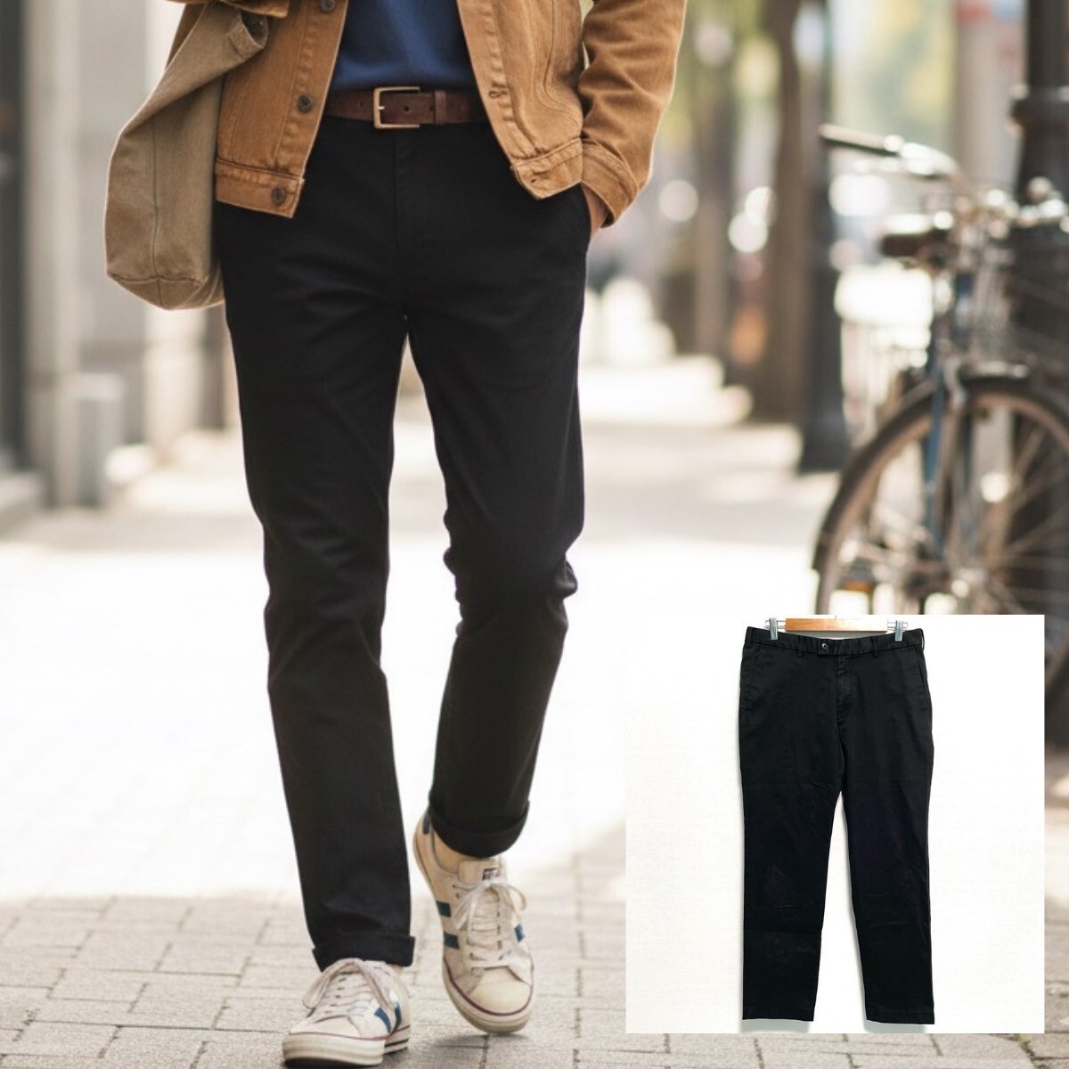 高品質で人気の高い【ユニクロ】のブラックチノパンツです。シンプルで洗練されたデザインが魅力で、オン・オフ問わず幅広いシーンで活躍する一本◎ストレッチ素材を使用しており、適度な伸縮性があるため、動きやすく快適な履き心地です。ウエストは85cm。スリムながら窮屈さを感じにくく、日常使いに最適です◎ビジネスカジュアルや通勤のシーンはもちろん、動きやすさを活かしてゴルフや軽いスポーツシーンにもおすすめ!!シャツやポロシャツとの相性も抜群です◎ブラックカラーなので、どんなトップスにも合わせやすく、季節を問わず長くご愛用いただけます!!