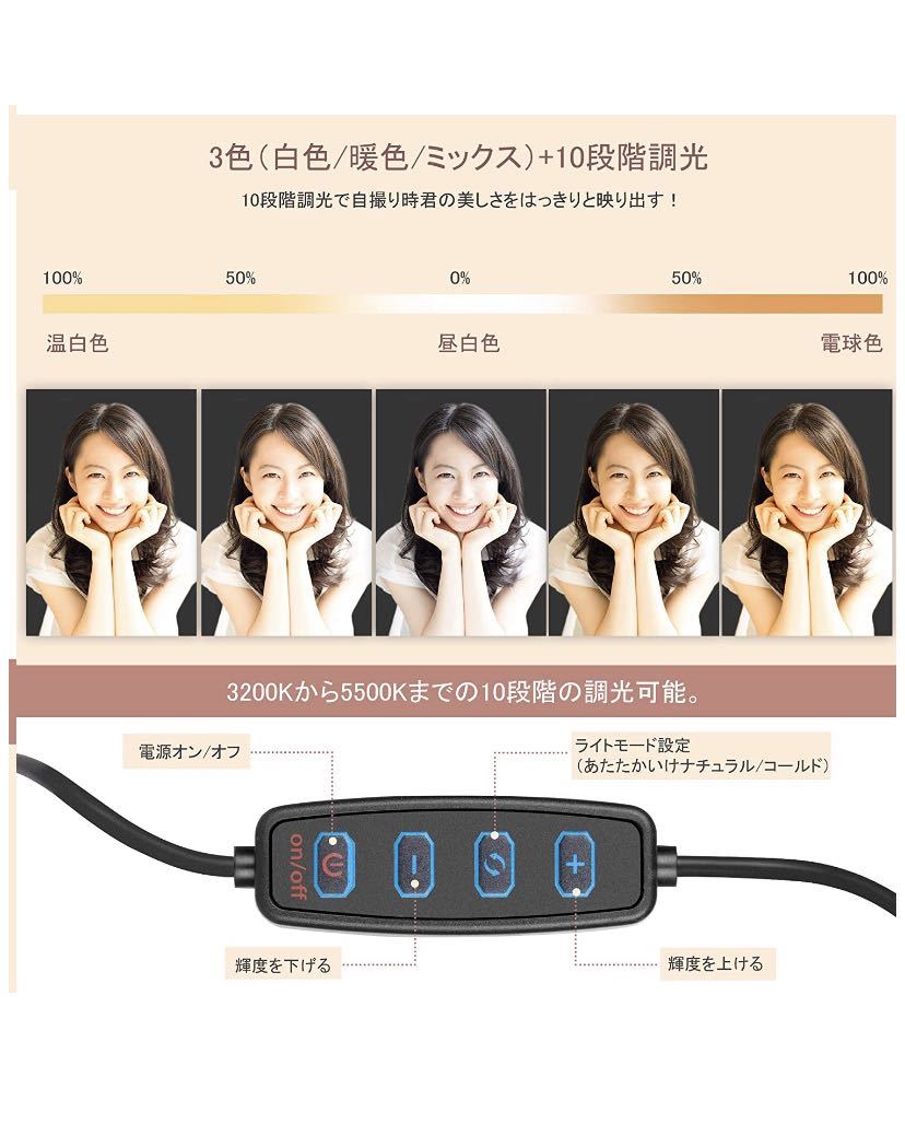 【3色10段階調光】本LEDリングライトは3色照明モードが付属して(白色/暖色/ミックス)、コントロールで色のモードを選べます、卓上の照明撮影用ライトキットとして最適です。コントロールで3200Kから5500Kまでの10段階の調光は可能。お体に対する放射線を出さないので是非ご安心。