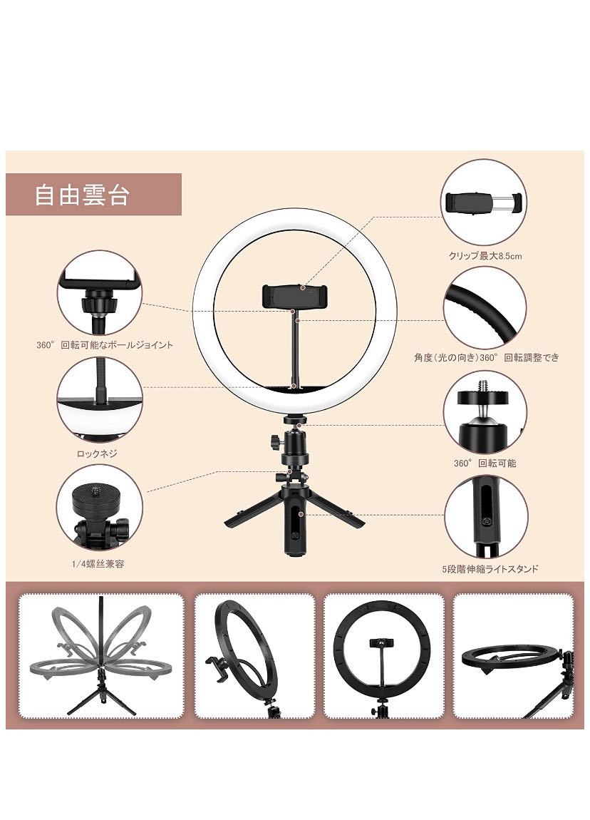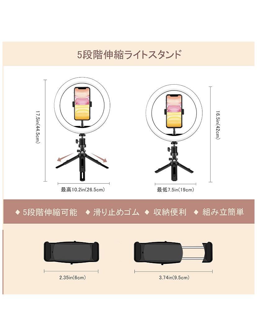 【5段階伸縮ライトスタンド】: ライトスタンドは優れたABS材を採用して設計します。リングライトの底部に三脚のデザインによりしっかり卓上に固定しやすいです。5段階伸縮可能なので、便利性が抜群!底部の接触面に滑り止めゴムが付き、擦りキズに心配はありません。収納またはリングライトの組み立ても非常に簡単です。