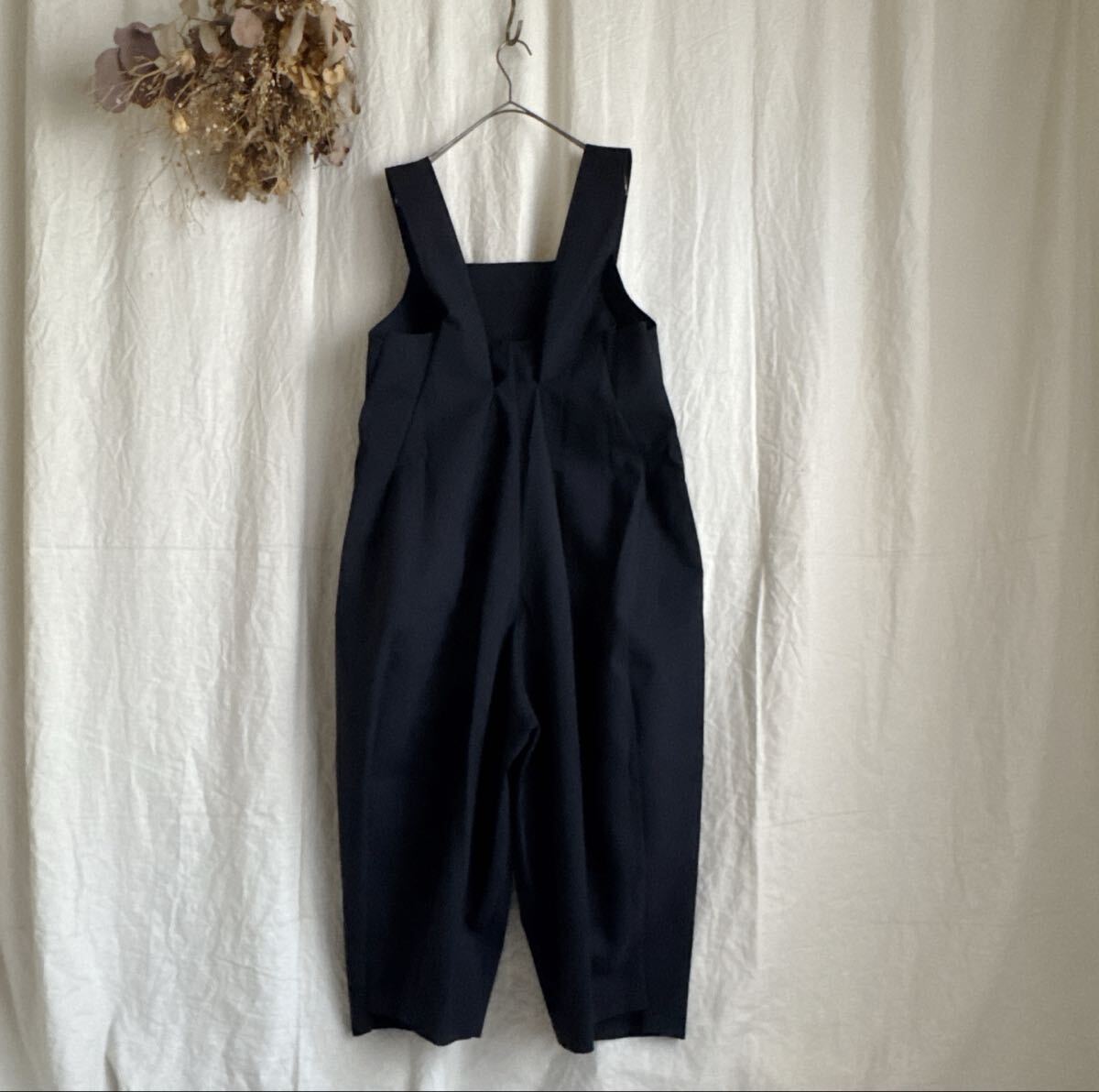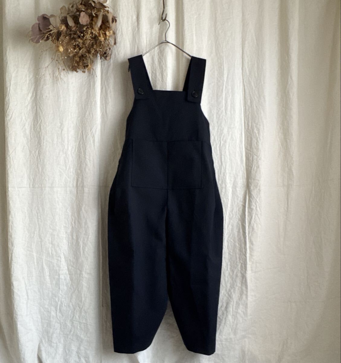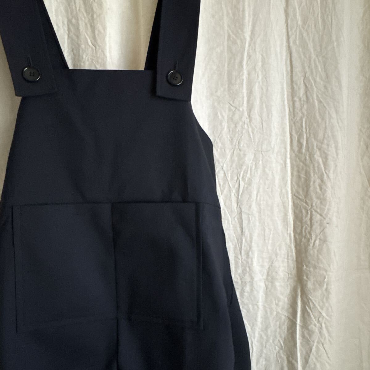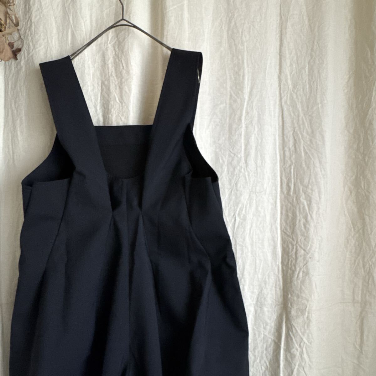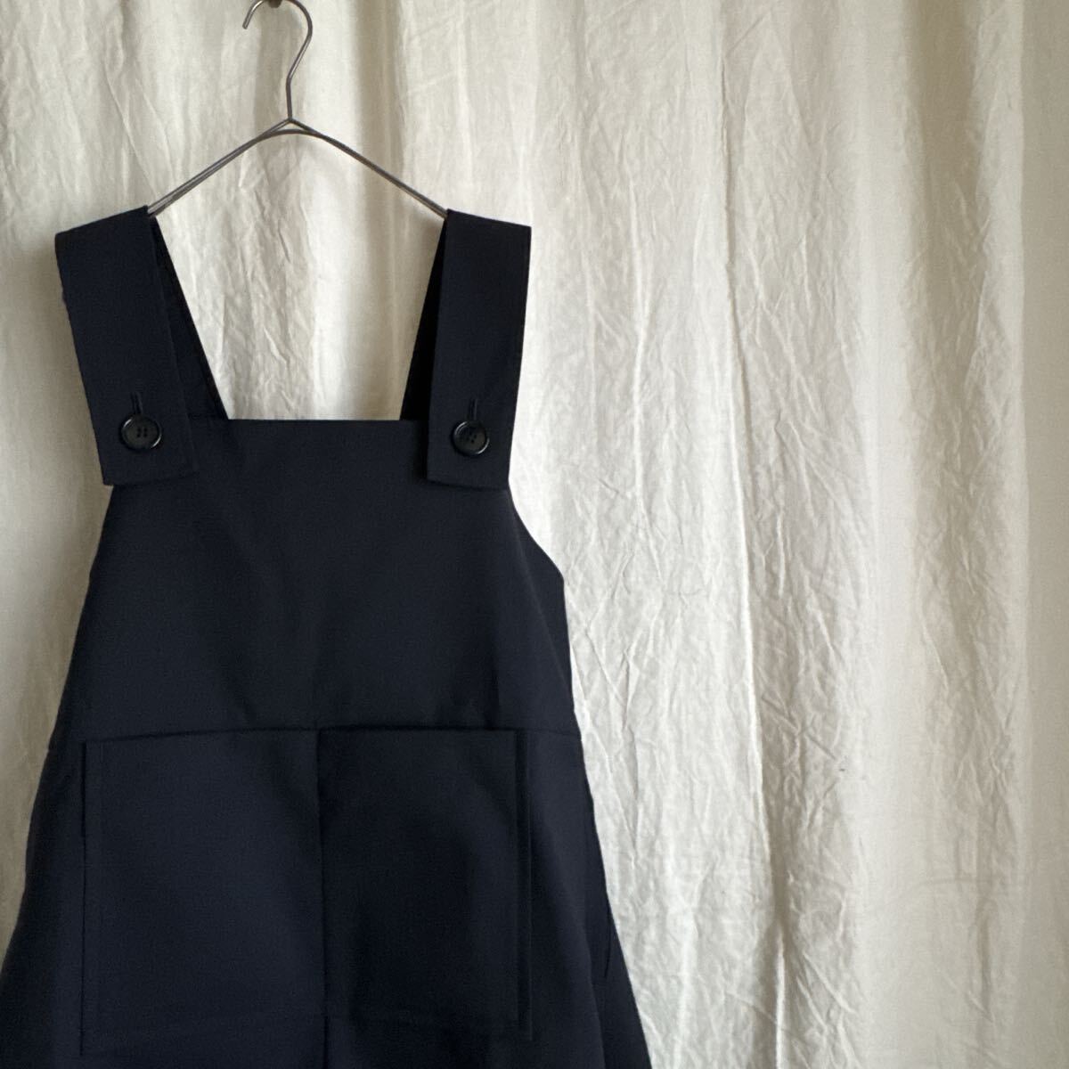 フロントボタン留めの肩紐をかけて着用していただけ、サイドやバックや裾などにタックやダーツ施されており、ウエストのフロント&左右にポケットがございます。