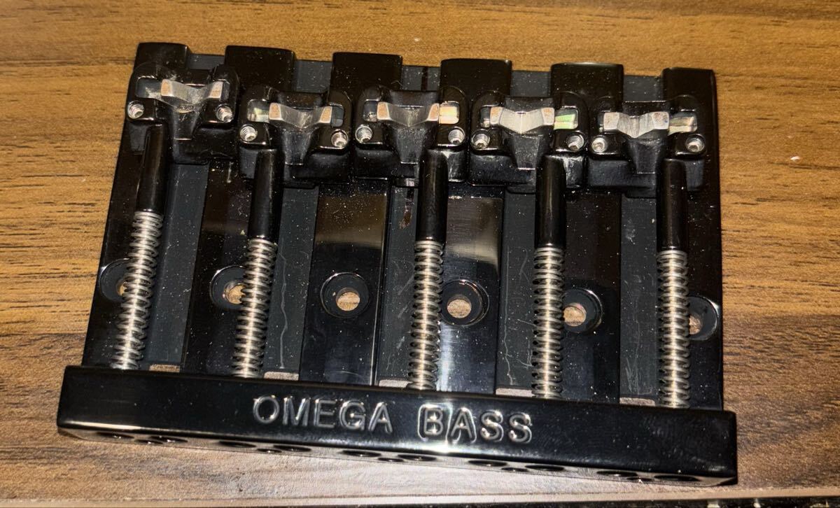 ALLPARTS BB-3360-003 5-String Omega Bass Bridge Blackにhip shot製のサドルが付いているため、弦間ピッチの調整が自在にできます。
