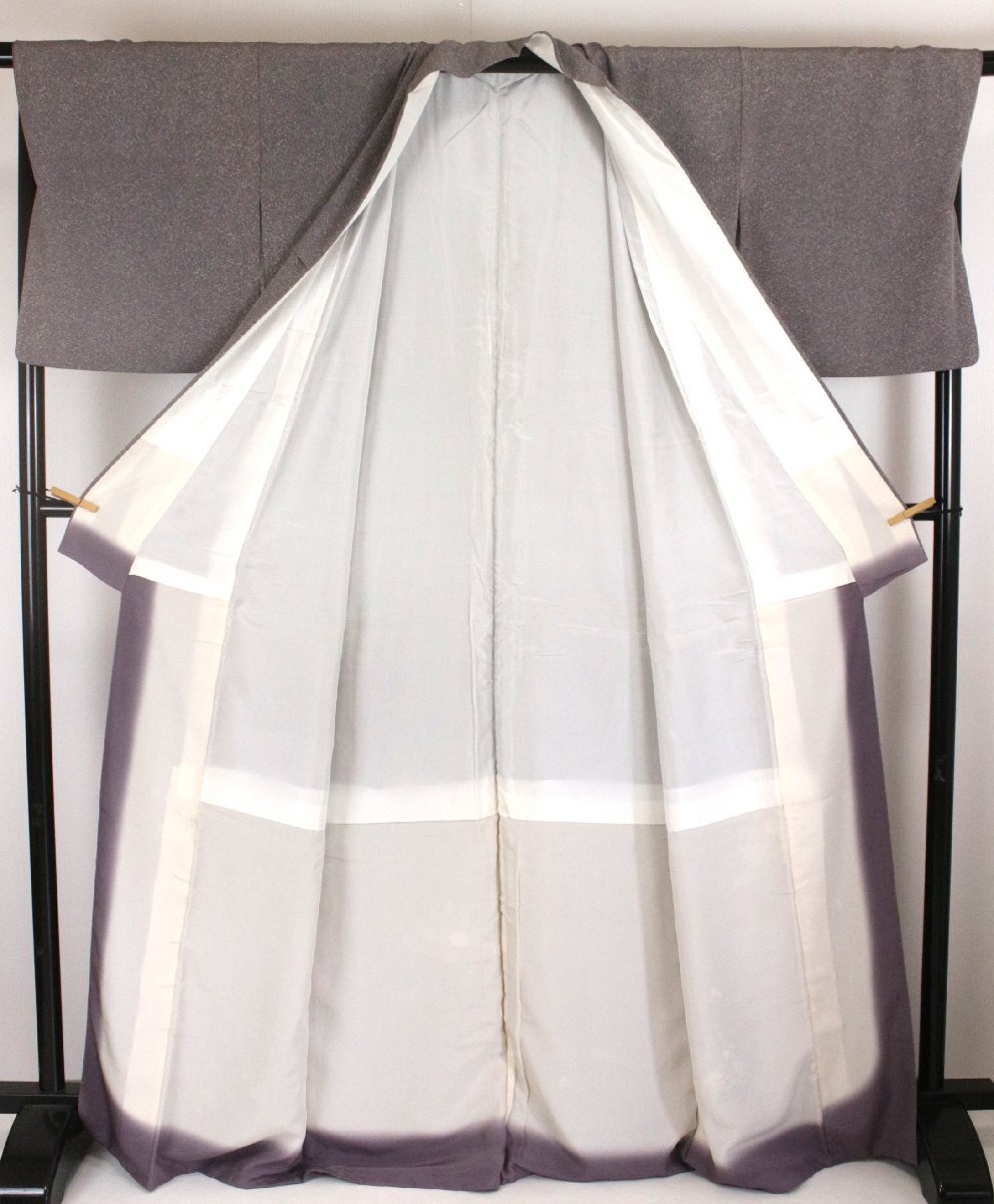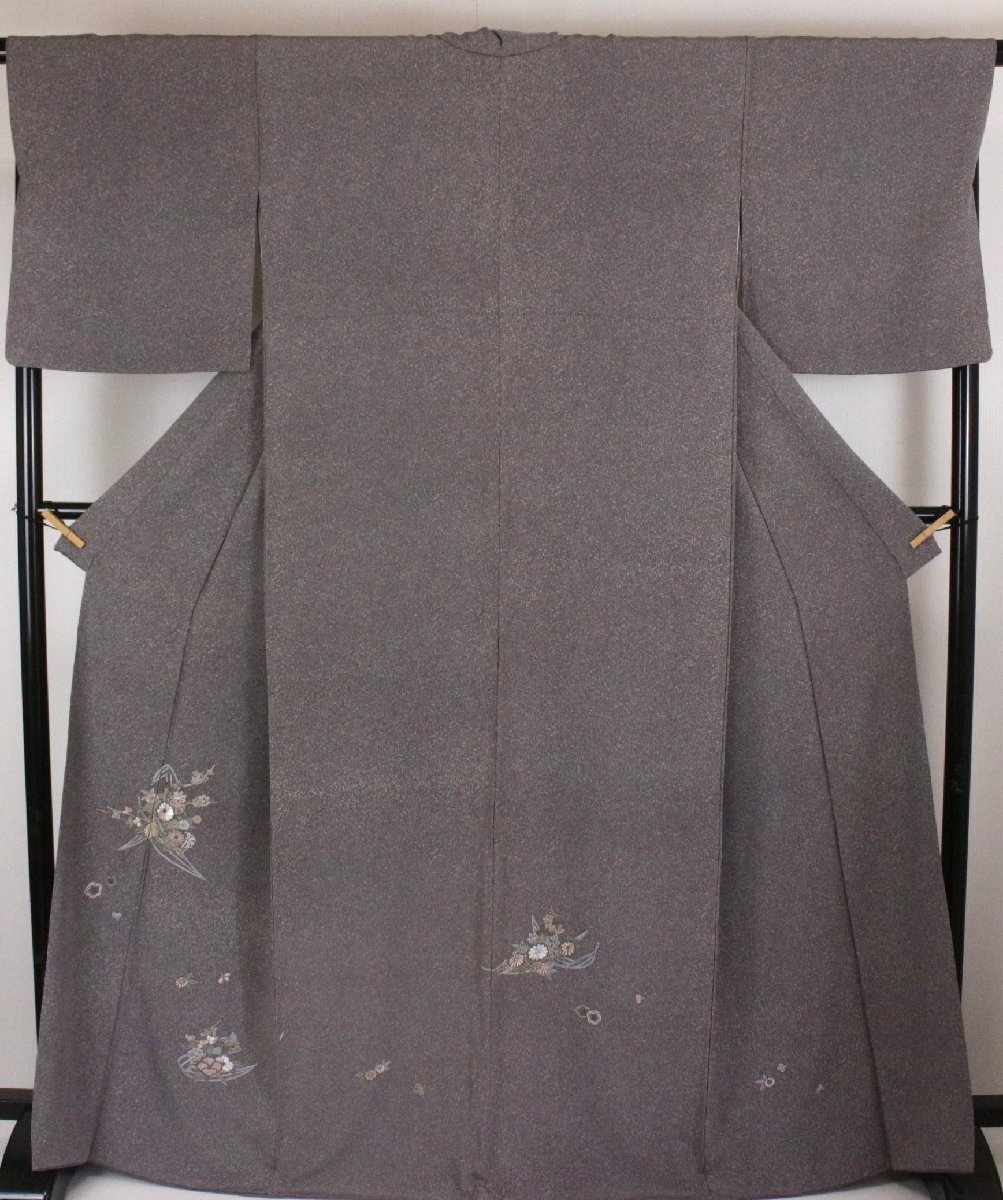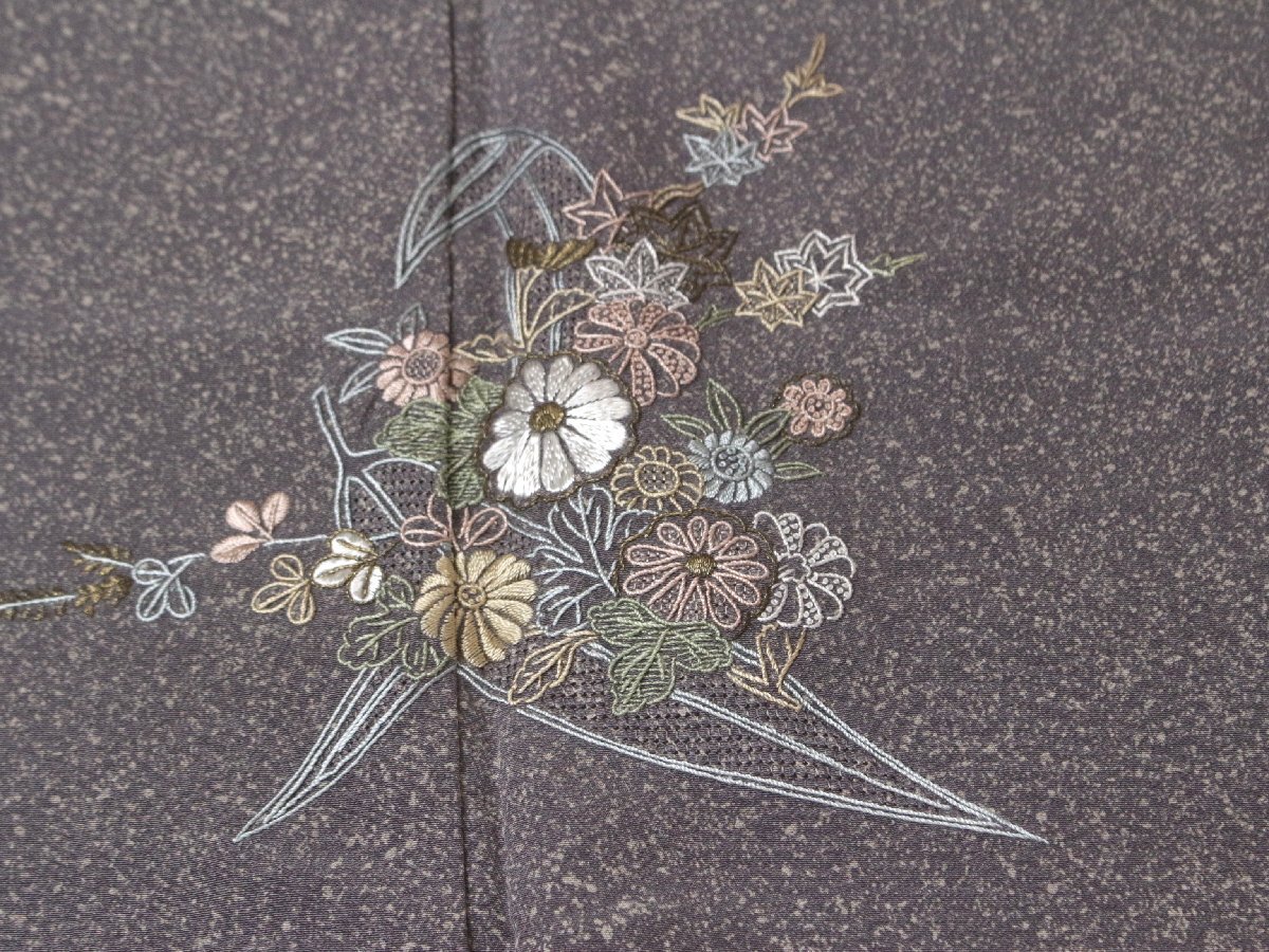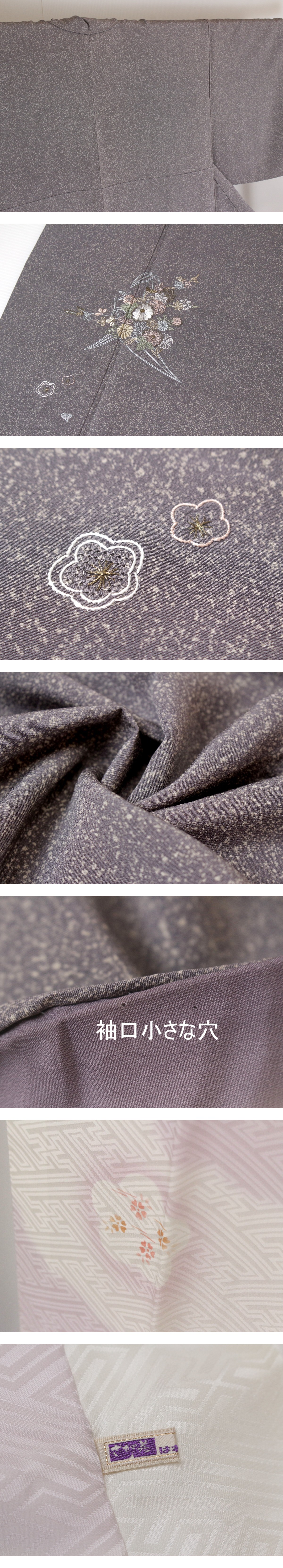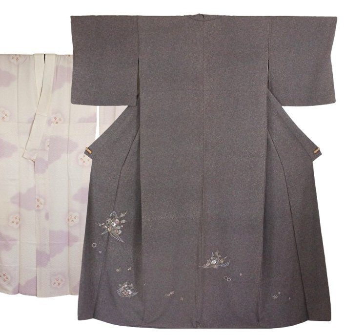 蘇州刺繍が施された正絹附下と長襦袢のセット のご紹介です。 深みのある灰紫色の地に、繊細な蘇州刺繍が施された附下。草花文様が丹念に刺し描かれ、糸の艶やかさと立体感が際立つ、格調高い仕上がりとなっています。落ち着いた地色に映える上品な色糸の調和が、洗練された大人の装いを演出いたします。 セットの長襦袢は、白地に淡い紫の雲取りと小花文があしらわれた優美な意匠。柔らかな正絹の風合いが心地よく、訪問着との重ねによって、内側からふわりと雅な雰囲気を引き立ててくれます。 刺繍の美しさと正絹の上質感が織りなす逸品を、ぜひこの機会にお手元へ。 特別な日にふさわしい、優雅で華やかな装いをお楽しみください。 ※撮影時の部屋の照明によって画像の色に若干の差がございます。色味に差がございますことをご了承のうえご検討下さいませ。 …状態… 着物:背縫いと八掛に若干の黄変。袖口に小さな穴あり。 長襦袢:目立つ難なし。 ※全くの新品ではございませんので、記載のない変色やスレ、ヤケ、その他僅かな難がある場合がございます。そのような理由でのキャンセルはお受けできませんので、ご了承の上ご検討お願いいたします。 |