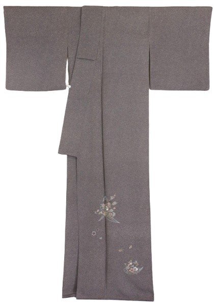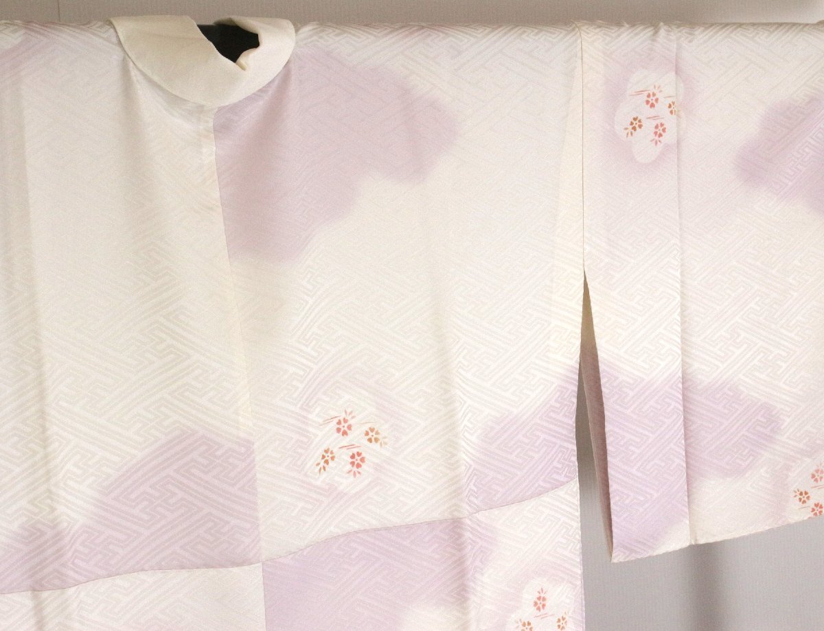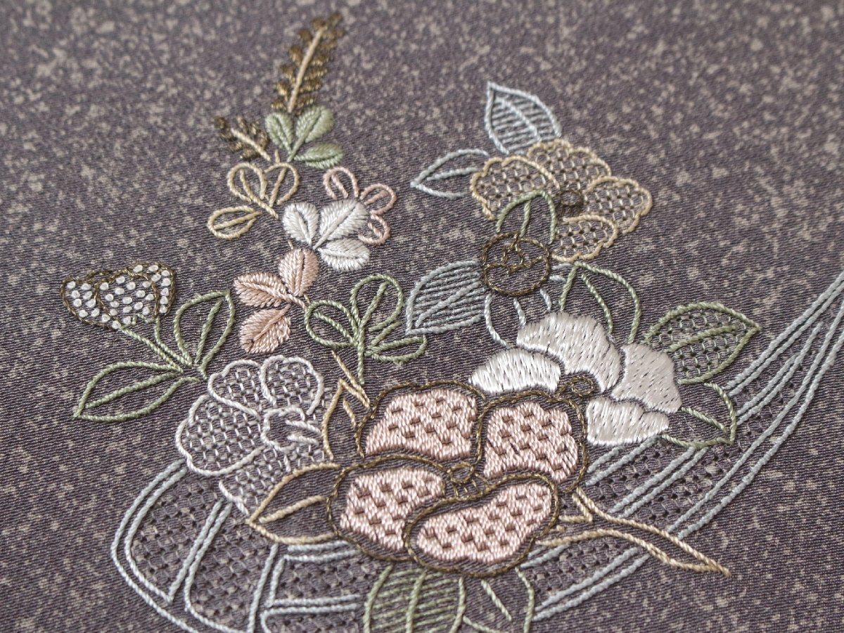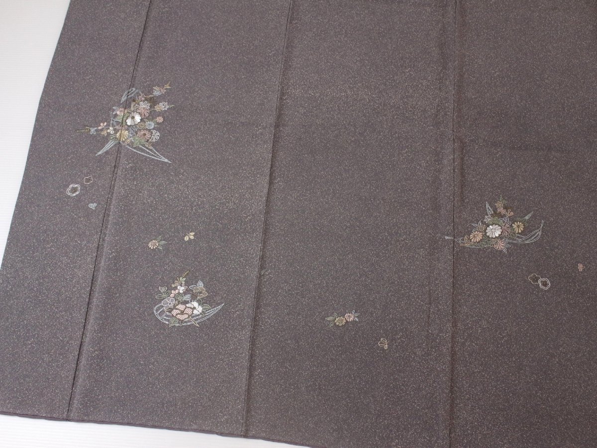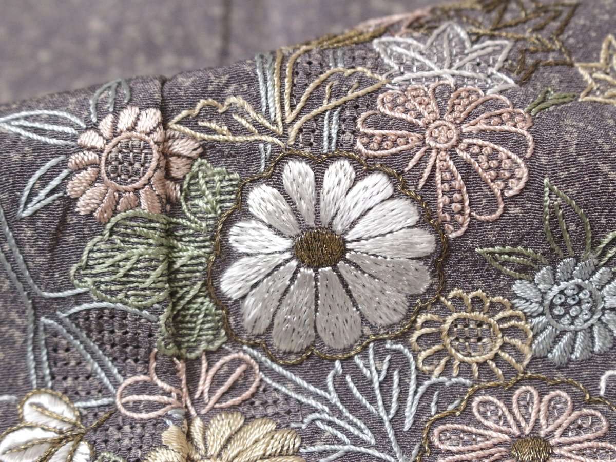 蘇州刺繍が施された正絹附下と長襦袢のセット のご紹介です。 深みのある灰紫色の地に、繊細な蘇州刺繍が施された附下。草花文様が丹念に刺し描かれ、糸の艶やかさと立体感が際立つ、格調高い仕上がりとなっています。落ち着いた地色に映える上品な色糸の調和が、洗練された大人の装いを演出いたします。 セットの長襦袢は、白地に淡い紫の雲取りと小花文があしらわれた優美な意匠。柔らかな正絹の風合いが心地よく、訪問着との重ねによって、内側からふわりと雅な雰囲気を引き立ててくれます。 刺繍の美しさと正絹の上質感が織りなす逸品を、ぜひこの機会にお手元へ。 特別な日にふさわしい、優雅で華やかな装いをお楽しみください。 ※撮影時の部屋の照明によって画像の色に若干の差がございます。色味に差がございますことをご了承のうえご検討下さいませ。 …状態… 着物:背縫いと八掛に若干の黄変。袖口に小さな穴あり。 長襦袢:目立つ難なし。 ※全くの新品ではございませんので、記載のない変色やスレ、ヤケ、その他僅かな難がある場合がございます。そのような理由でのキャンセルはお受けできませんので、ご了承の上ご検討お願いいたします。 |