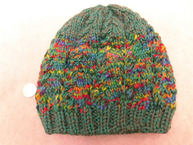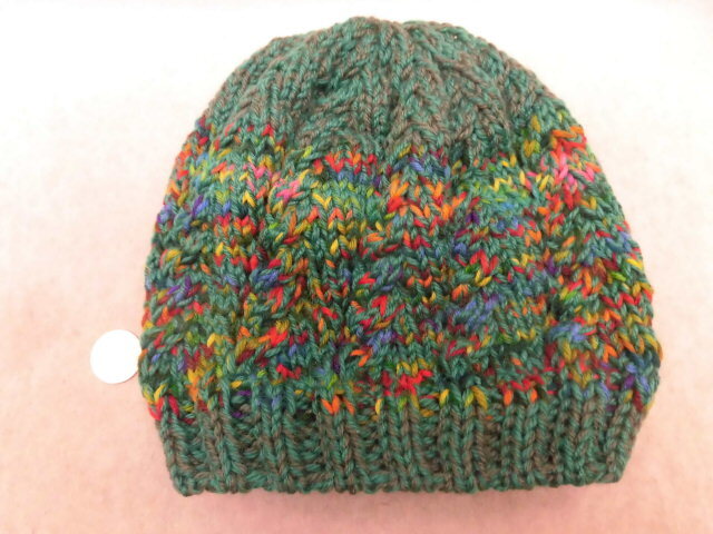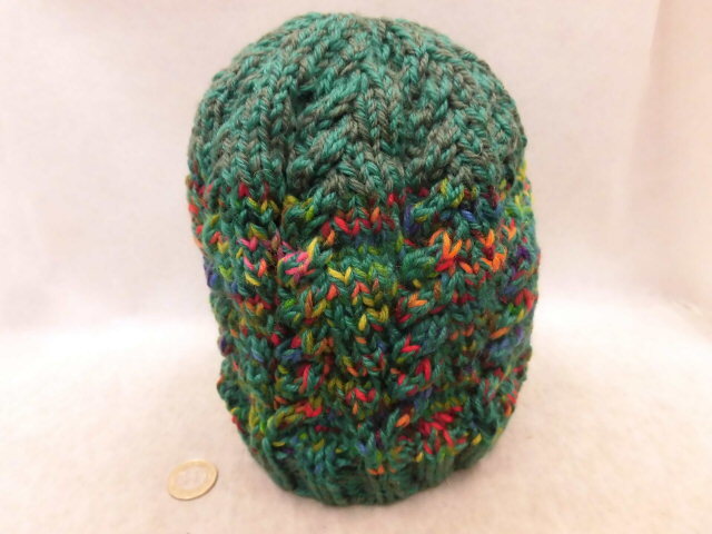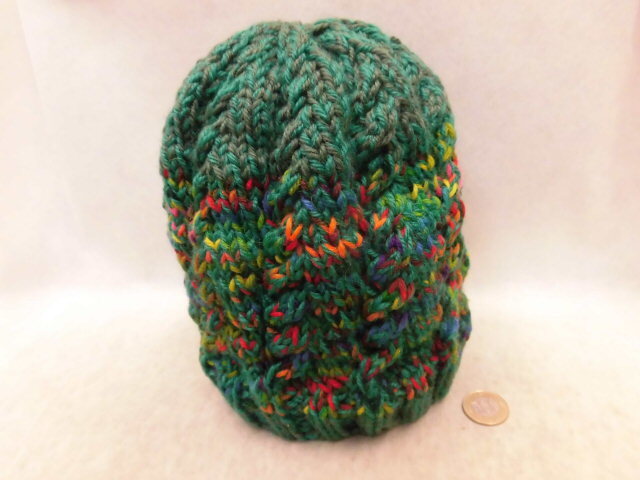 ☆手編み帽子26BB166☆緑色系ツートン縄らせん模様の帽子