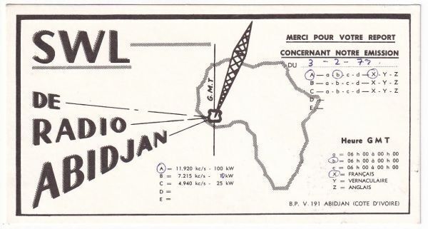 | 商品説明 | Radio Abijan のベリカードです。カード取得者の名前は出品上、画像から消してあります。詳細は写真をご覧ください。 |