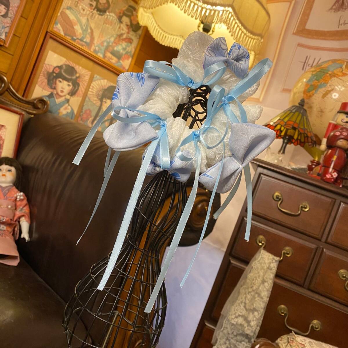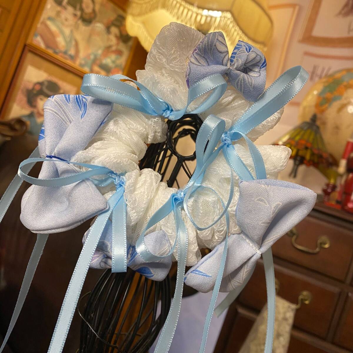 ミルキーなアイスブルーの着物地と、粉雪みたいなレース布を重ねた二層シュシュ。ふっくら結んだ和布のミニリボンに、淡空色サテンの細リボンが揺れて、光の角度で唐花風の地紋がふわっと浮かびます。透明感たっぷり、清楚×ガーリーの一本。