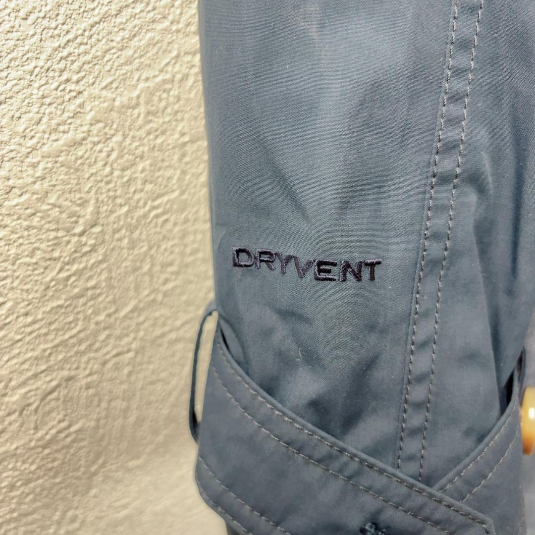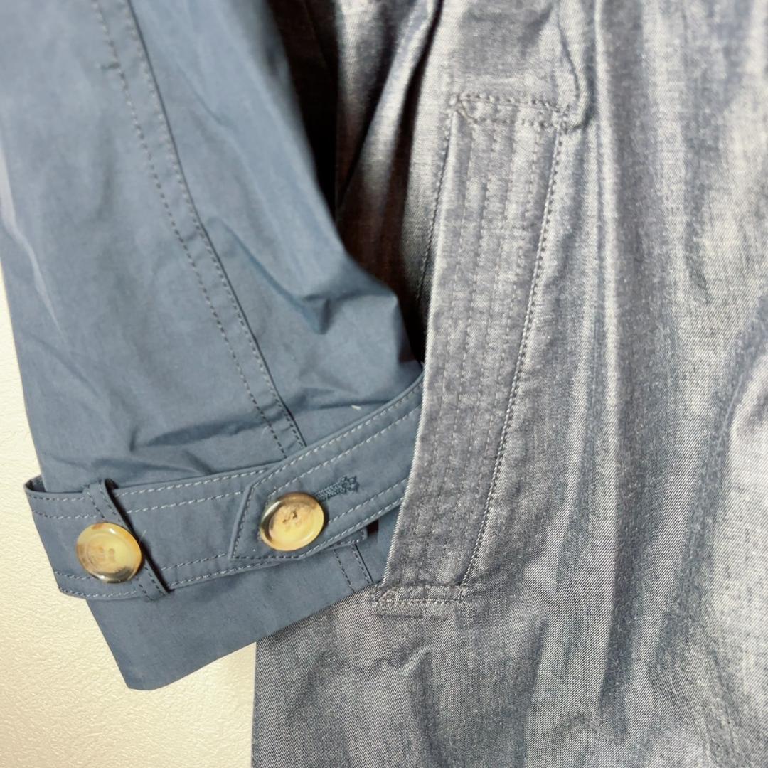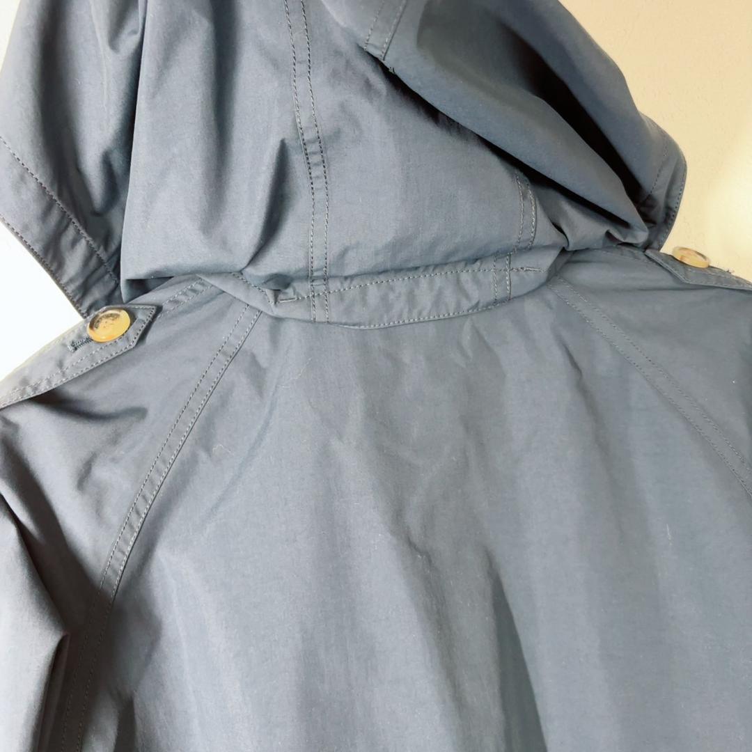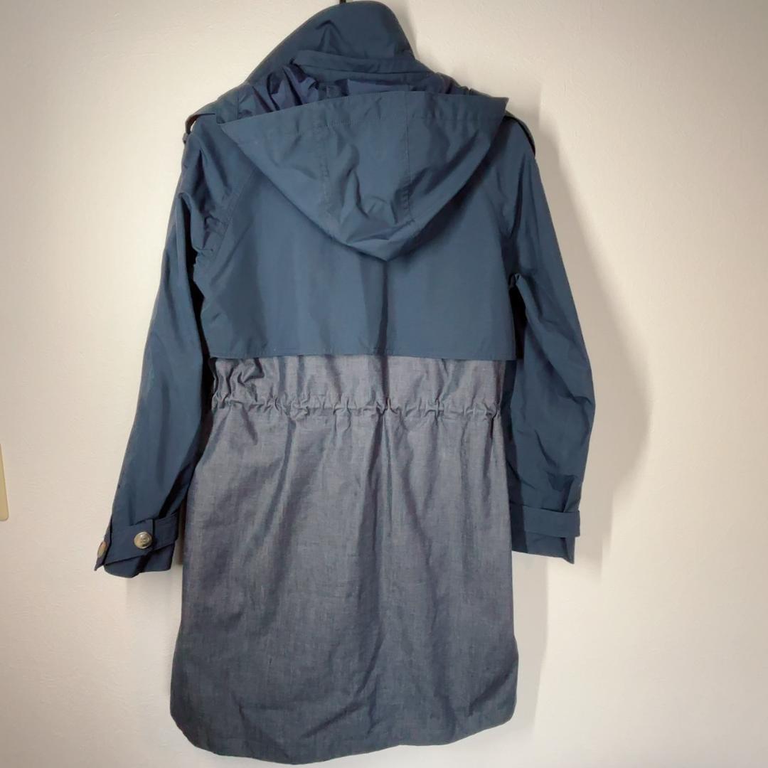 上身頃は無地ネイビー、スカート部分はデニム調の切替え。フード付きで、フードは取り外し可能。背面はケープ風ヨーク+ウエストギャザーでシルエット良く着られます。袖口はボタンタブ仕様、両サイドポケットあり。タウンユースから通勤まで幅広く活躍します。