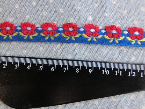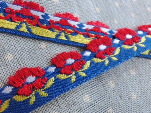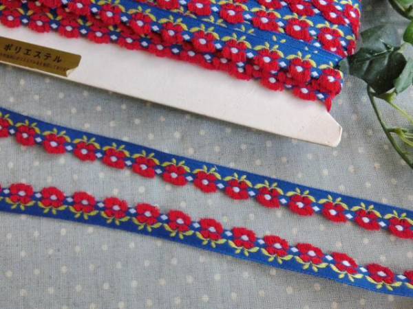 レトロ手芸雑貨*防縮チロル・ブルー地赤いお花・長さ100cmより延長可☆リボン装飾リメイク