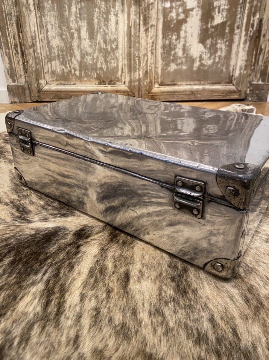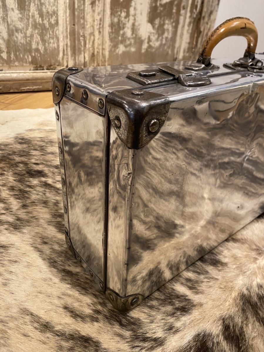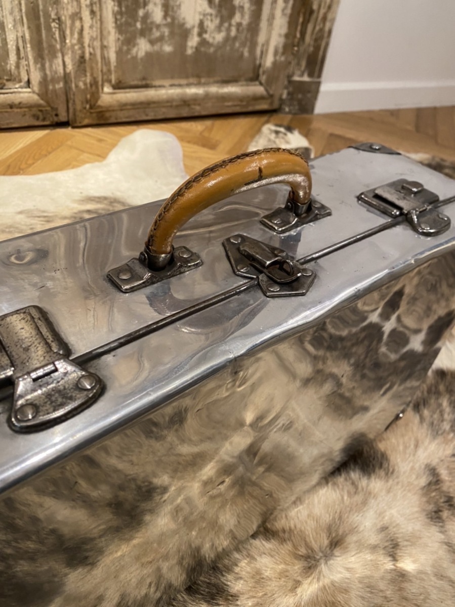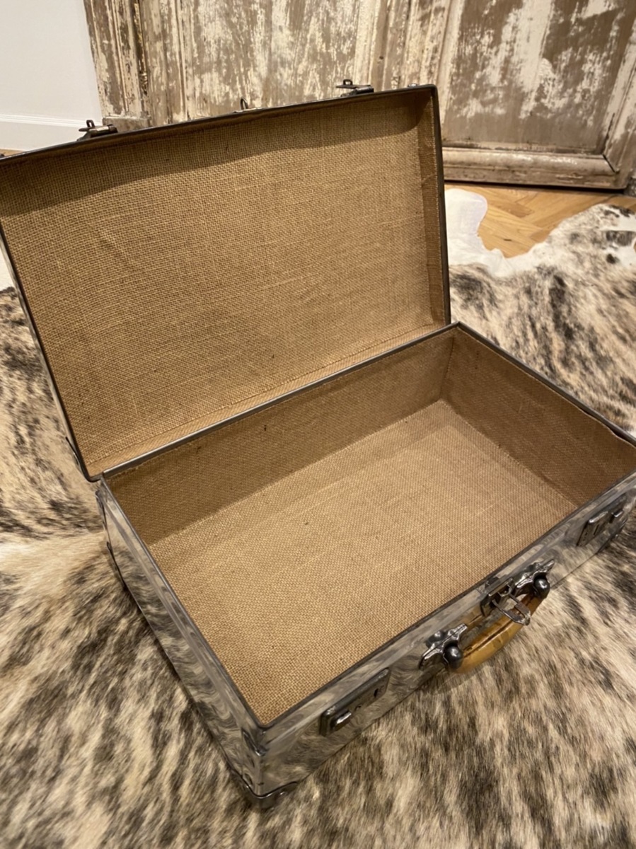 本体はアルミ製、内貼りは麻素材の生地、レザーベルト、鍵は真鍮製、鍵の付属なし。