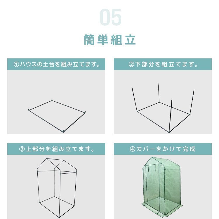 お庭やベランダでガーデニングを楽しみたい方のマストアイテム! 簡単設置!通気性抜群!オールシーズン活躍のガーデンハウスです。 ■オールシーズン、大切な植物を守ります! 冬?春先にかけては、ビニール温室に入れてあげることで、 冷たい風や雪、霜などが、直接当たるのを防ぎます。 屋外飼育のメダカ・金魚の越冬や雨避けにもビニール温室が最適! 猫や鳥などの外敵からも守ります。 ビニールカバー前面には両サイドファスナーが付いているので、 冬場でも温室内の温度上昇が気になる時には、ビニールを巻き上げ風通しを良くするなど、 天候に合わせて調節できます。 カバーを固定できる紐つき仕様となっており、巻き上げて作業しやすいように固定できます。 ■工具不要で簡単に組み立て 組立時に道具不要!パイプを差し込むだけで簡単に組み立てができます! 転倒防止のペグ付きで、安全にご使用頂けます。 ■商品コード:AAH007GR ■商品仕様 サイズ(約):幅125×奥行き95×高さ190cm 重量(約):3.3kg 素材:ビニール(カバー)、スチールパイプ(フレーム) 付属品:ロープ×4、ペグ×4 ■注意事項 ・お客様組立の商品です。 ・強風の際には外での使用をお控えください。 ・組立て方や商品の個体差により、サイズは若干差異が生じる場合がございます。予めご了承下さい。 ・商品は、モニターによって色合いが異なって見える場合があります。 ・仕様・デザインは改良のため予告なく変更することがあります。 ■保障期間 7日間 ※商品到着後7日以内の初期不良・破損のみご対応させていただきます。 【新品未使用品です】 |