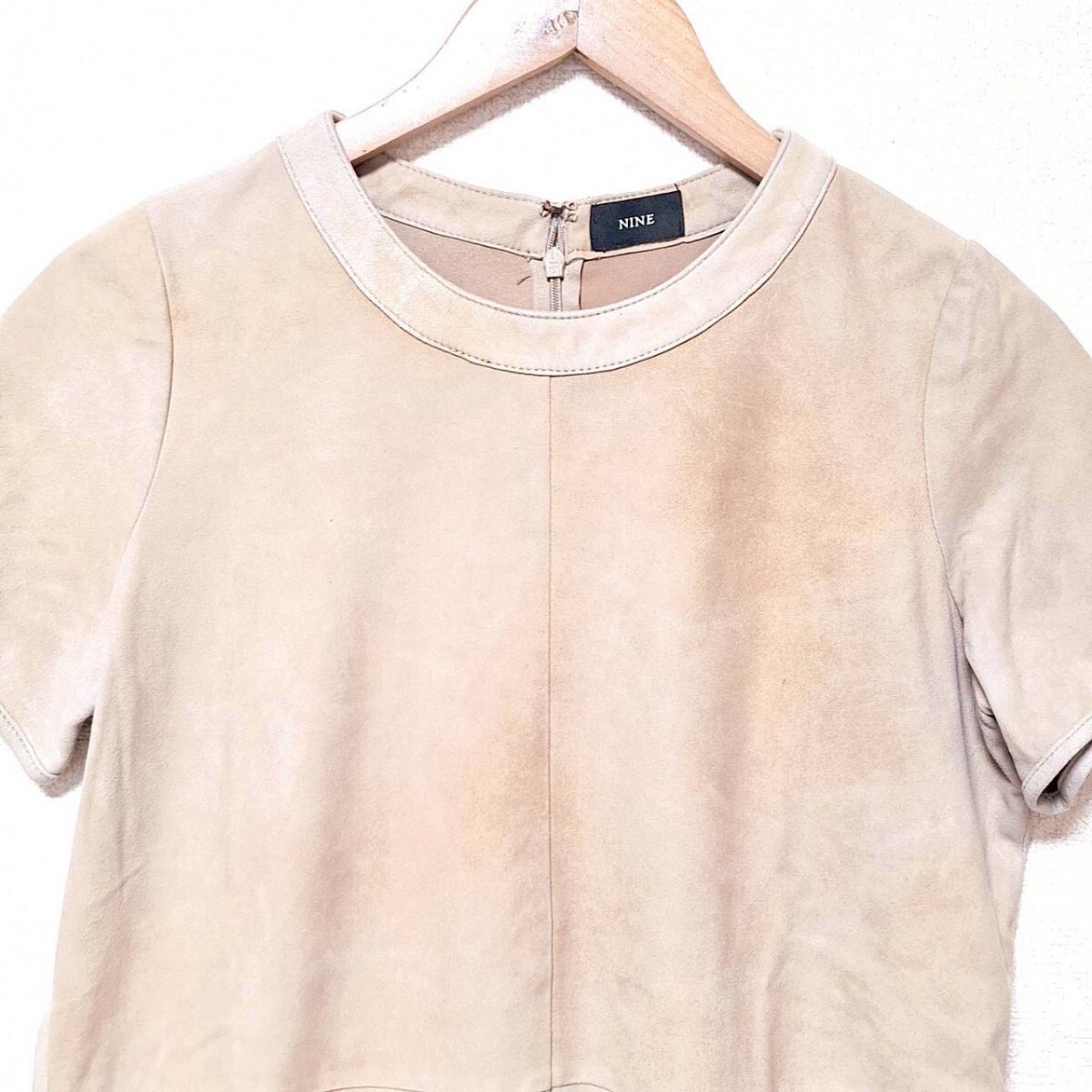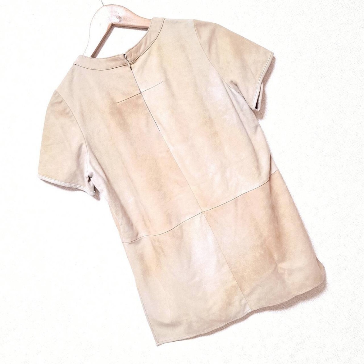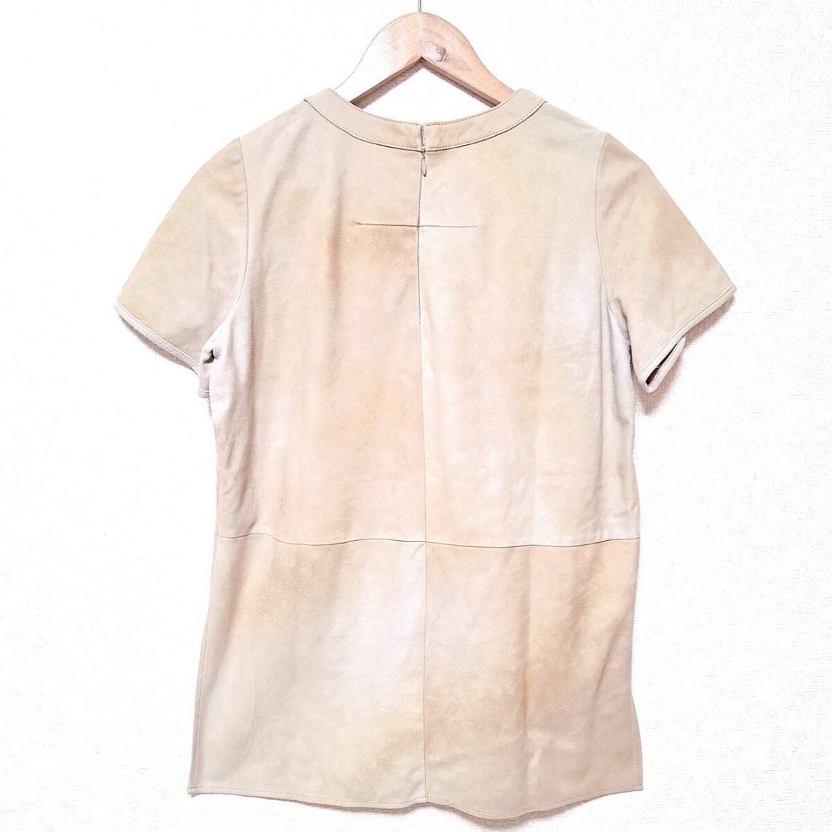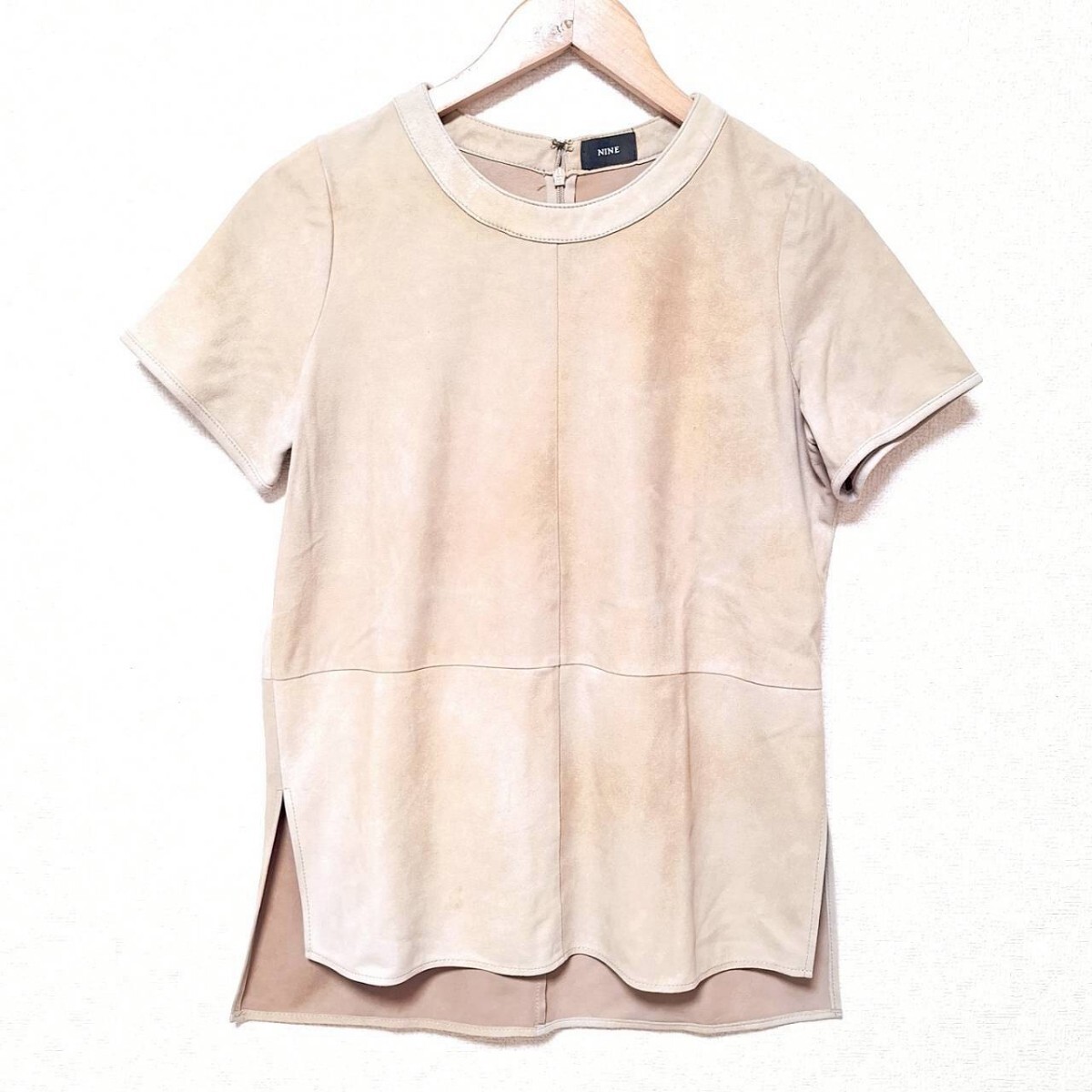 W278【NINE】ナイン Tシャツ カットソー 半袖 クルーネック スリット 本革 ヤギ革 レザー シンプル 無地 ベージュ レディース F(S相当) /ee