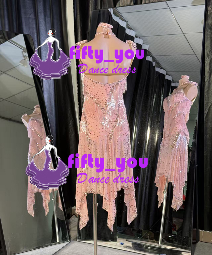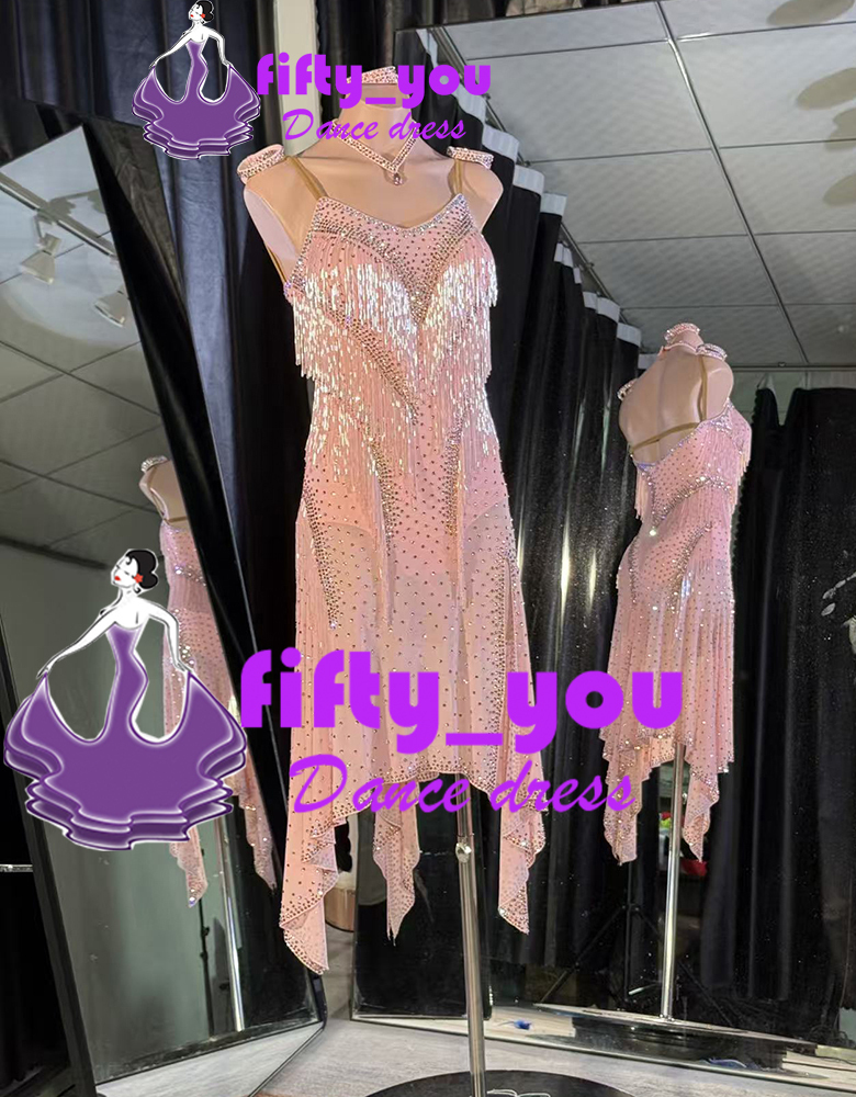 新品fifty_you セミオーダードレス 社交ダンス衣装  高級品  お洒落ラテン競技発表用ダンスドレス  輝きビーズいっぱい飾り ピンク
