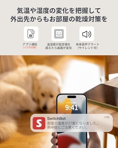 【アラート通知機能&遠隔確認】3種類のアラート「本体の警告音、ディスプレイの数値が点滅、アプリ通知※」で、気温や湿度の変化を随時お知らせ。外出先にいてもお部屋の温湿度を確認し、アラート通知に基づいた乾燥対策が可能に!※SwitchBotハブ製品が必要