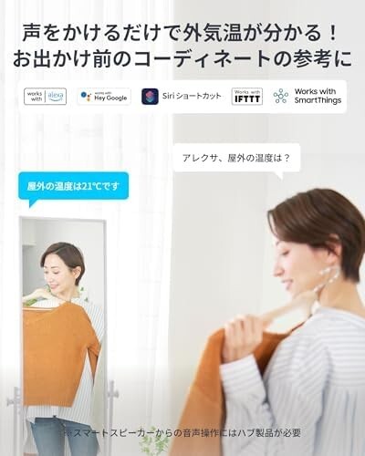 【声をかけて温湿度を確認】アレクサやGoogle アシスタントなどのスマートスピーカーと連携させると、手が離せないときでも「アレクサ、温度を教えて」と声をかけるだけで温度や湿度の確認ができて便利です。