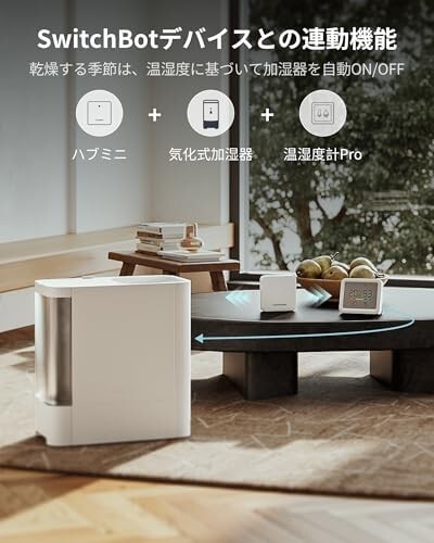 【SwitchBotデバイスとの連動】SwitchBotハブ製品や加湿器製品と併用すれば、予め指定した温湿度の快適数値を上回る、または下回ると加湿器が自動でON/OFF。温湿度に基づいた自動化で、秋・冬の乾燥からお肌やのどを守ります。
