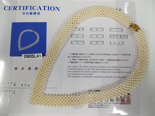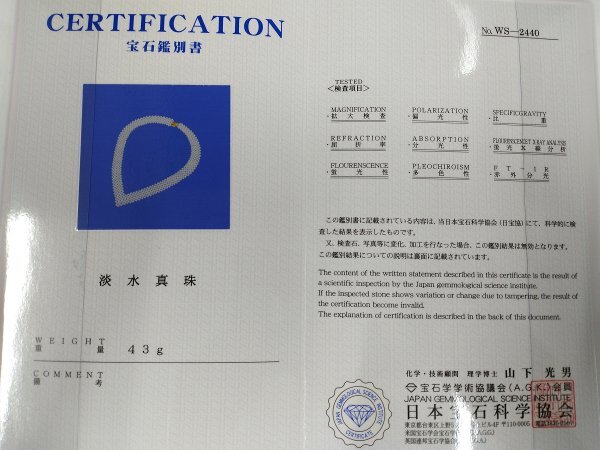 0905L41 本真珠 淡水真珠 ネックレス 宝石鑑別書付 約43g
