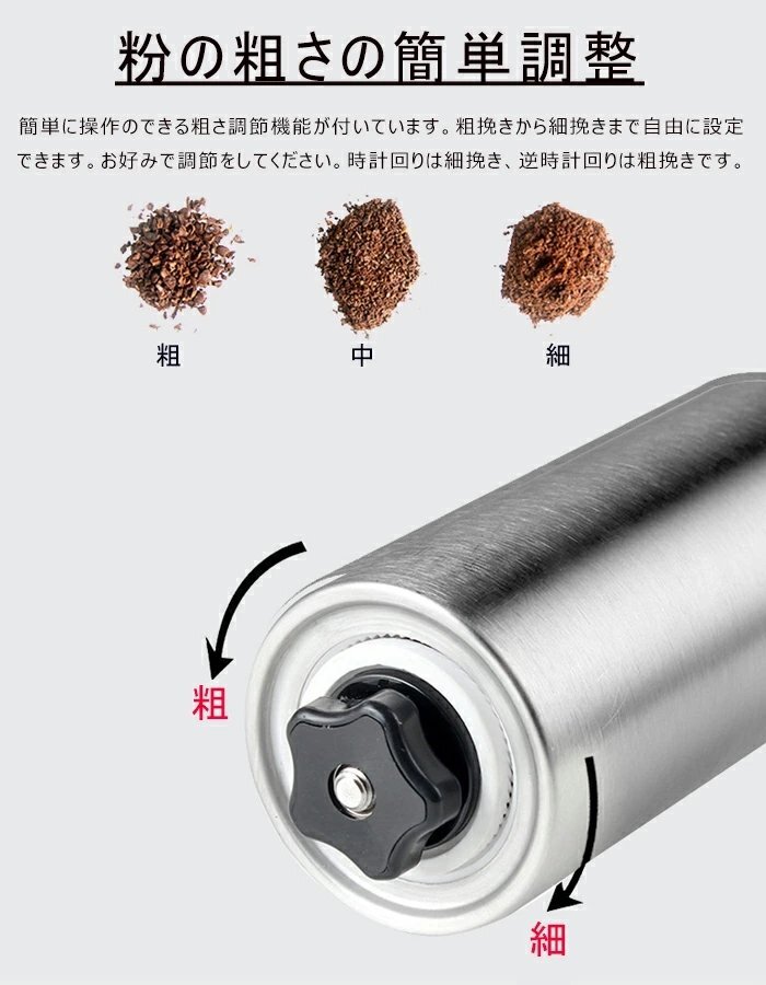 【簡単調節】簡単に操作のできる粗さ調節機能が付いています。粗挽きから細挽きまで自由に設定できます。お好みで調節をしてください。時計回りは細挽き、逆時計回りは粗挽きです。