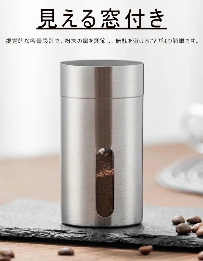 【デザイン性】ステンレス素材で錆にくくモダンなデザインが特徴です。手挽きコーヒーミルの内刃/外刃はセラミック素材でコーヒー豆を衛生的に取り扱えておいしいコーヒーが挽けます。