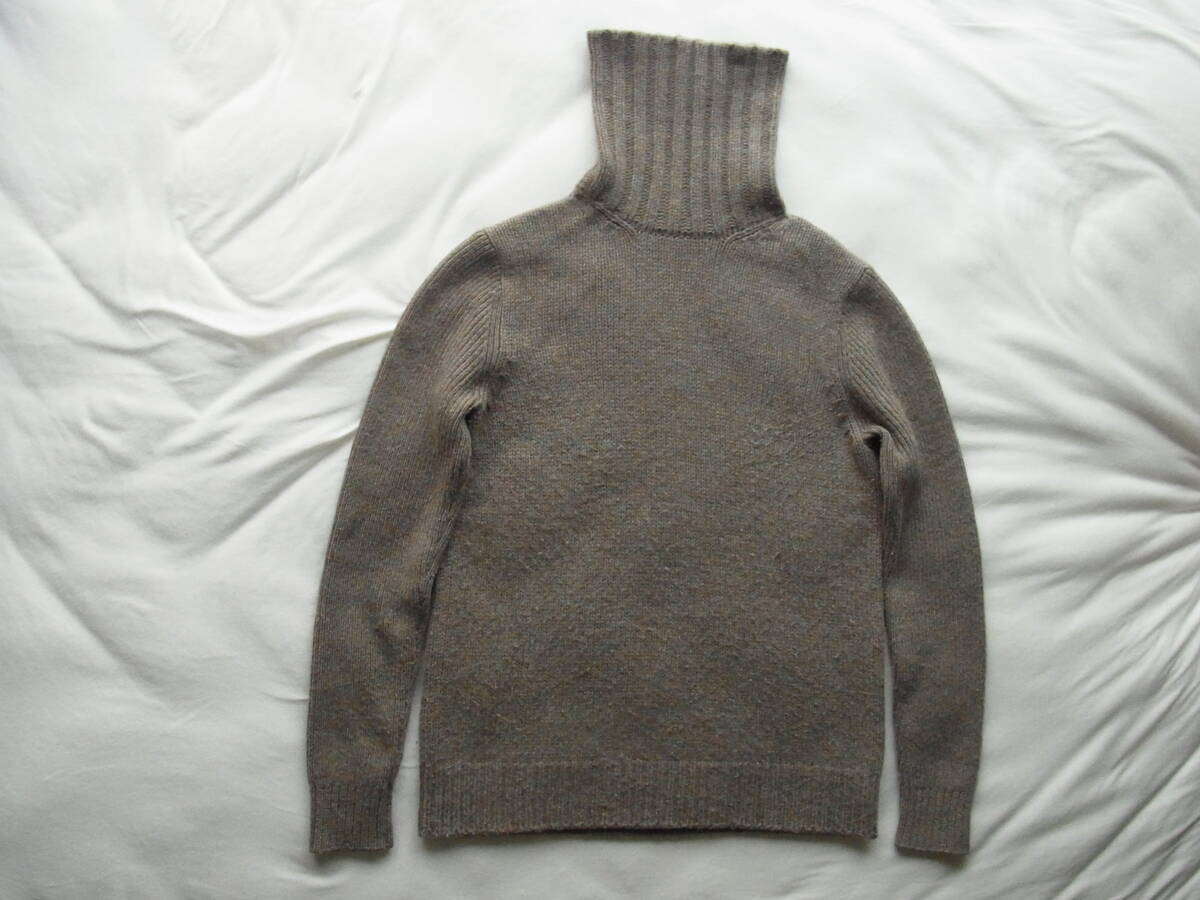 スローンのカシミヤ混ウールでミドルゲージのタートルネックセーターになります。USEDで着用感と6枚目の画像の様に多少の毛玉が御座います。それ以外には特に目立ったダメージ等は御座いません。