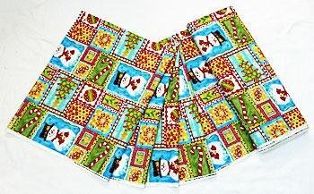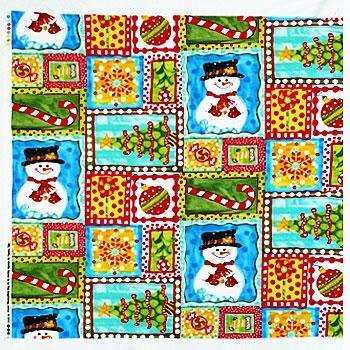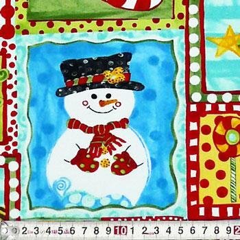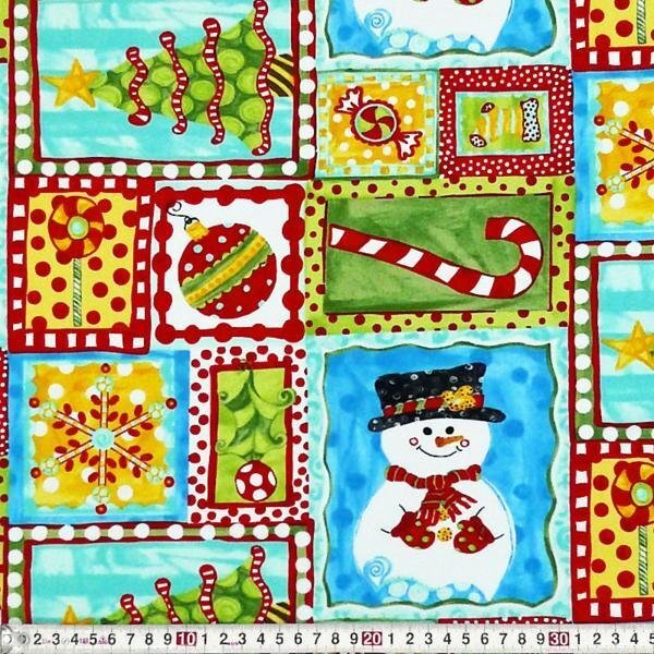 スノーマン、クリスマスオーナメント、キャンディバーなどのサンプラー柄。